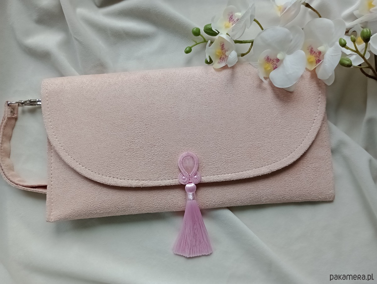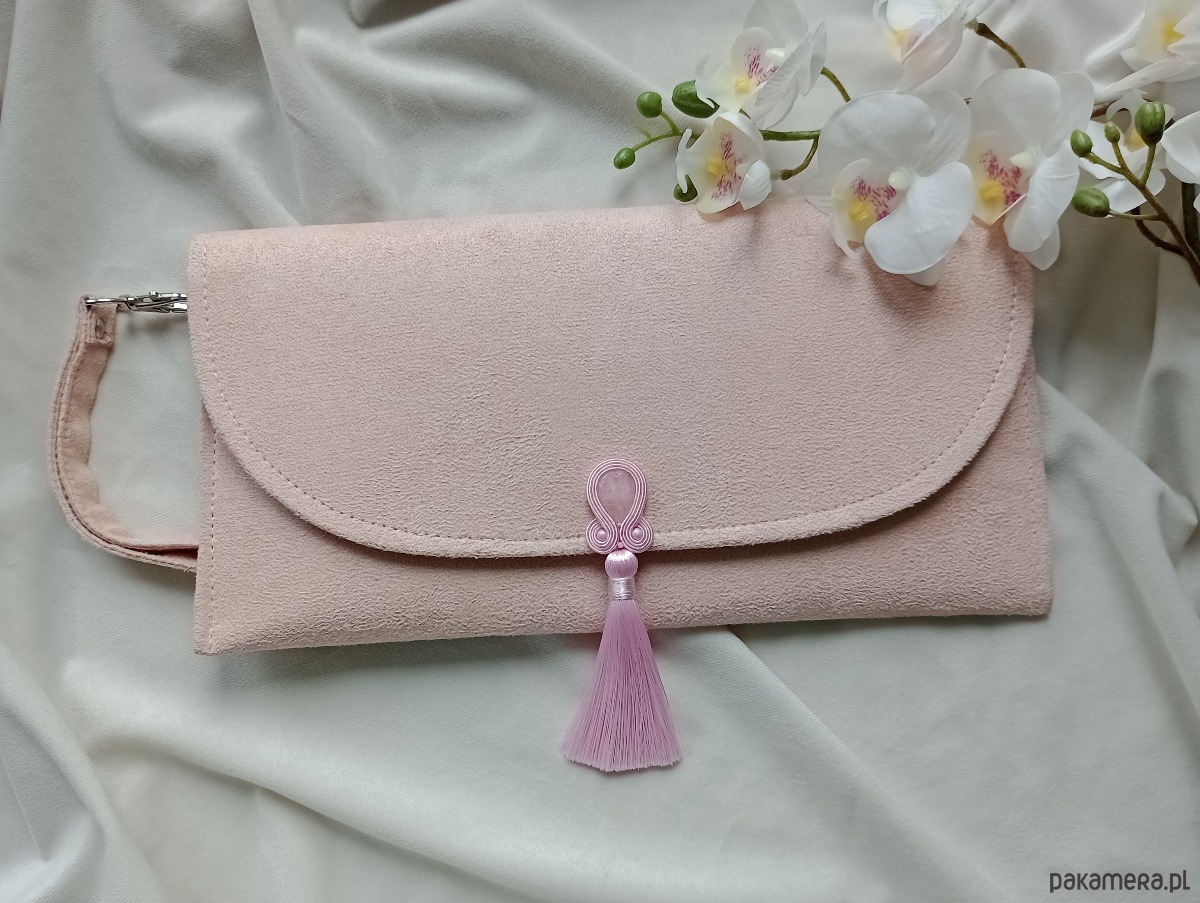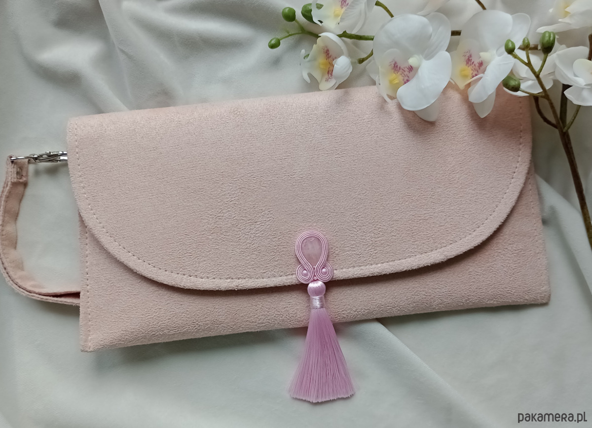 Torebka kopertówka z haftem soutache (sutasz). Pudrowa kopertówka, torebka do ręki nude.