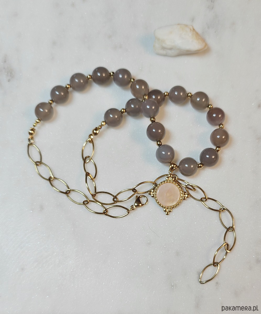 Naszyjnik z okazałych kul szarego agatu w nieco pudrowym odcieniu. To ponadczasowy wzór, pasujący do wielu stylizacji. Kamienie są zawieszone na łańcuchu, dzięki czemu mimo dużego rozmiaru naszyjnik nie jest ciężki, a w przedłużonej wersji zgrabnie się prezentuje. W zawieszce na zdobionym pozłacanym rombie znajduje się naturalny kamień różowego kwarcu - symbolu miłości. Naszyjnik jest elegancji, stylowy, dzięki pudrowej i pastelowej kolorystyce nieco romantyczny.