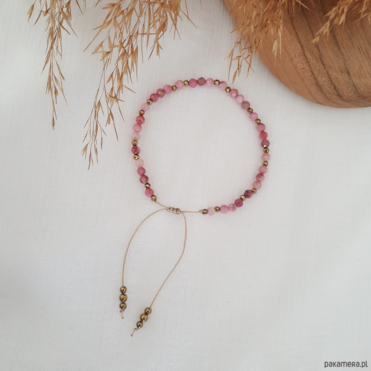 Bransoletka na wytrzymałej nitce jubilerskiej z kamieniami naturalnymi: RODONITEM i HEMATYTEM. Regulowane zapięcie pozwala na dowolne dopasowanie do nadgarstka.