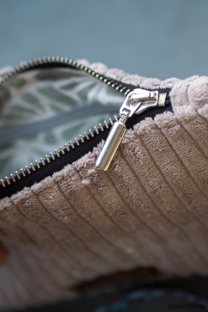 Małe zaszewki na dnie. Z tyłu oraz w środku torebki kieszonki zapinane na suwak. Środek wykończony bawełnianą podszewką.