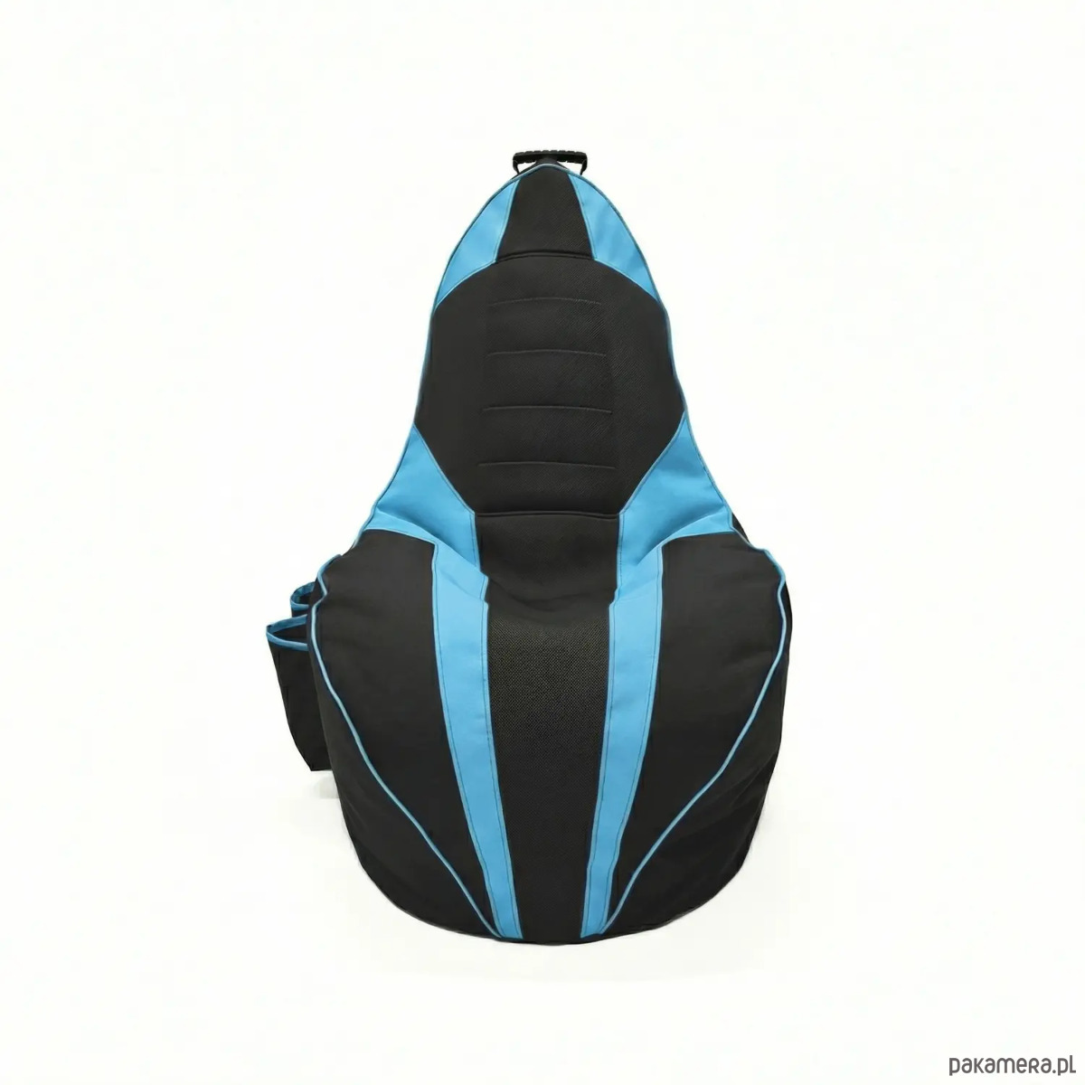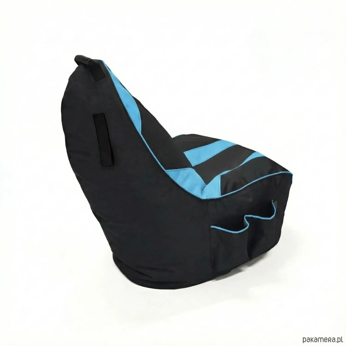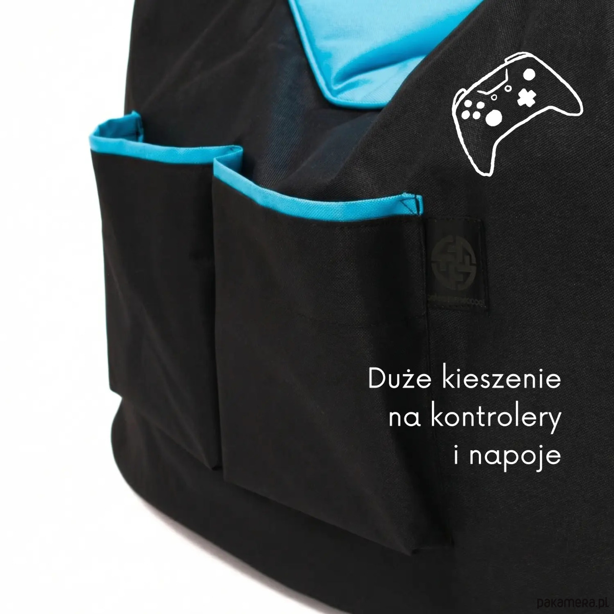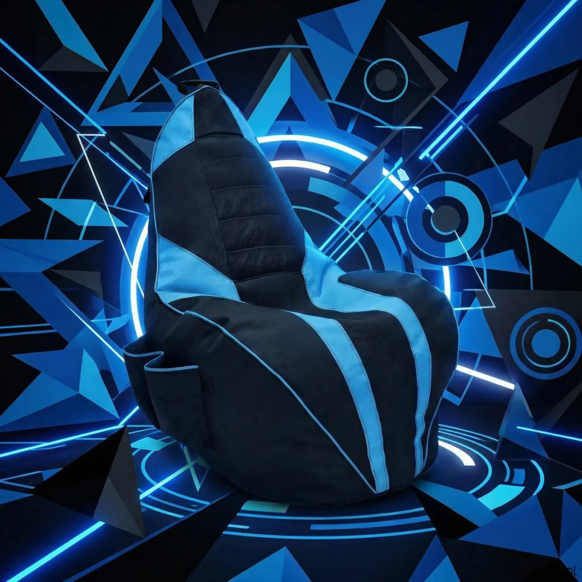 Model czarno‑niebieski łączy nowoczesny wygląd z praktycznymi rozwiązaniami. Po bokach znajdują się duże kieszenie na kontrolery i napoje, a na wysokości ramion wszyta jest taśma‑wieszak na słuchawki, dzięki czemu wszystko masz zawsze pod ręką.