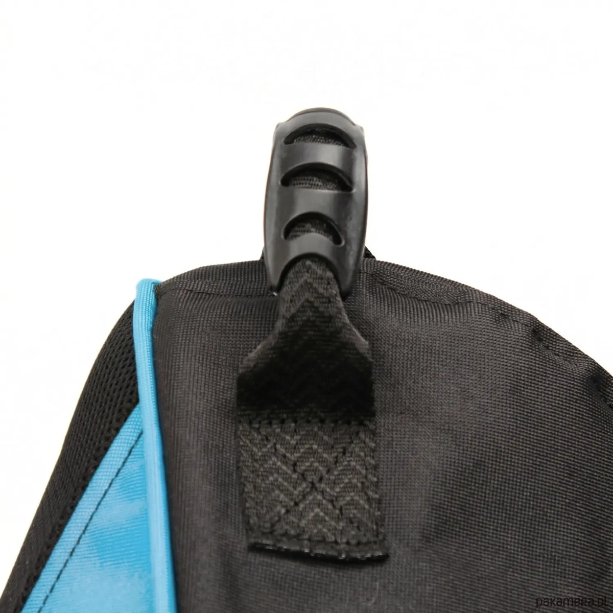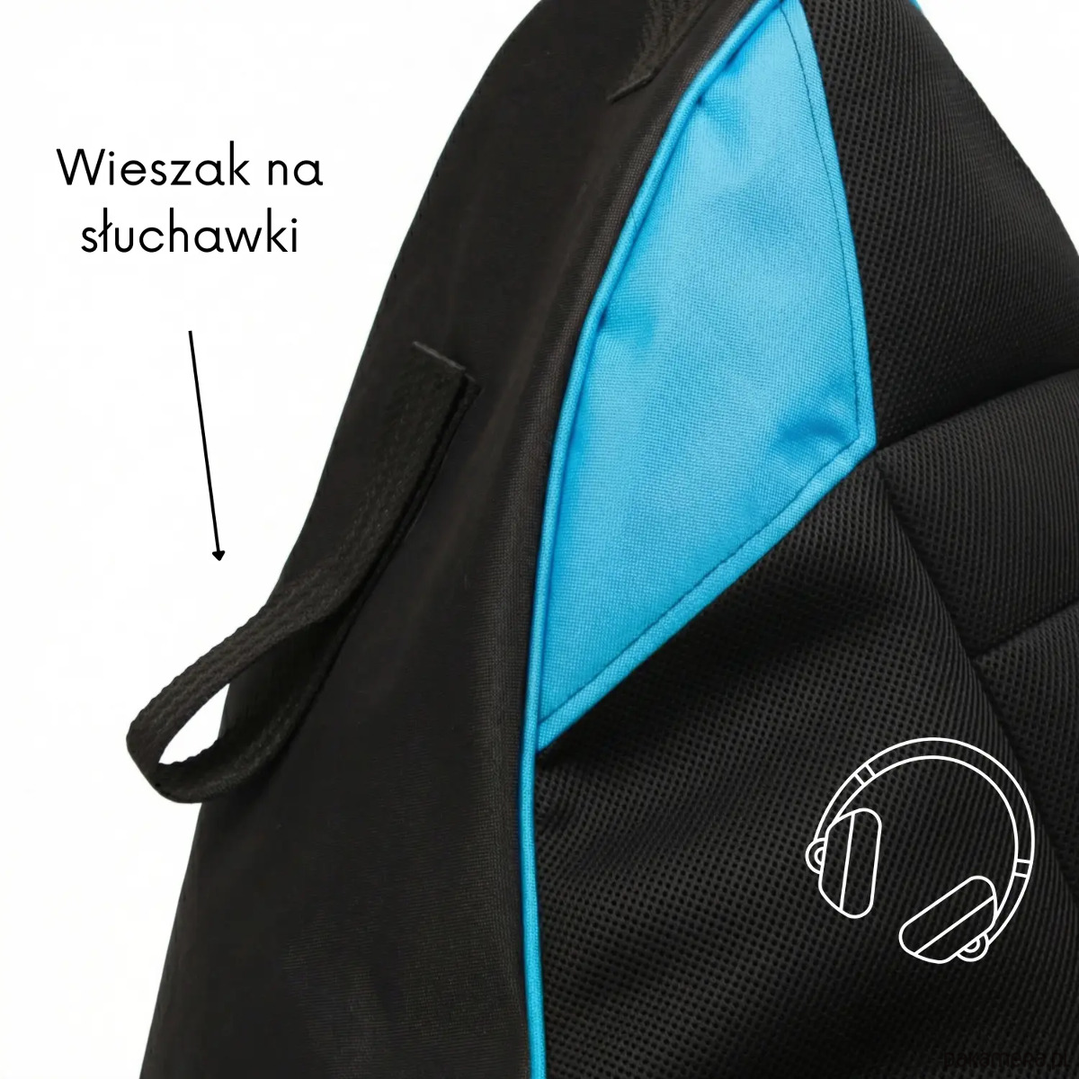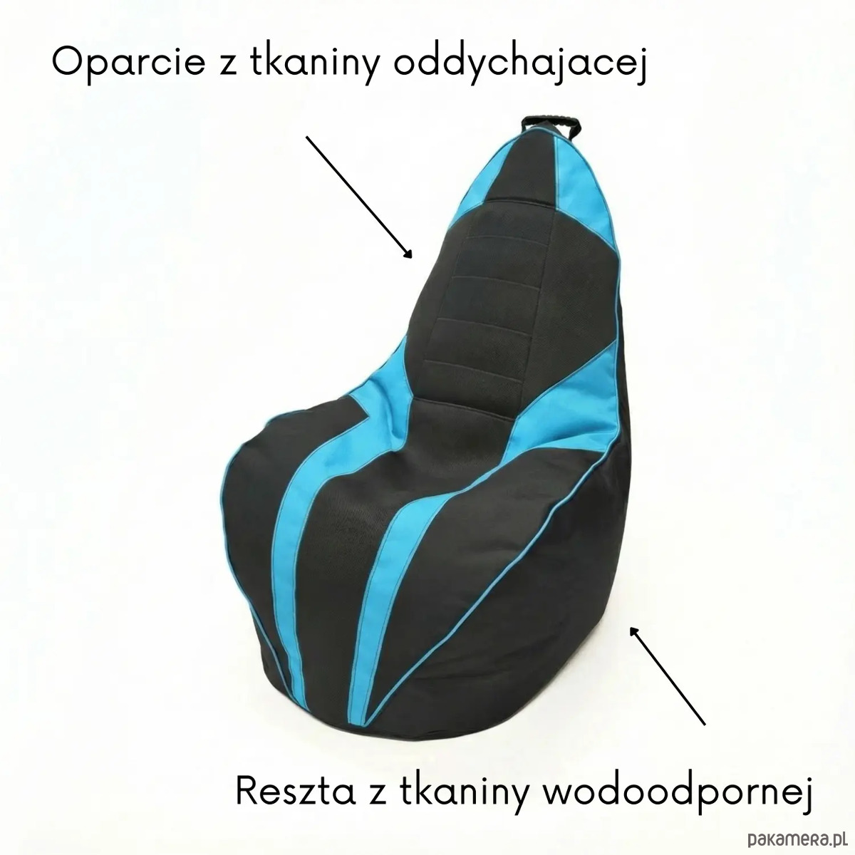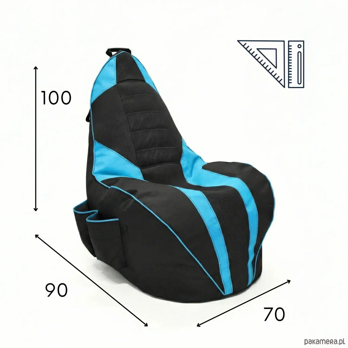 Model czarno‑niebieski łączy nowoczesny wygląd z praktycznymi rozwiązaniami. Po bokach znajdują się duże kieszenie na kontrolery i napoje, a na wysokości ramion wszyta jest taśma‑wieszak na słuchawki, dzięki czemu wszystko masz zawsze pod ręką.