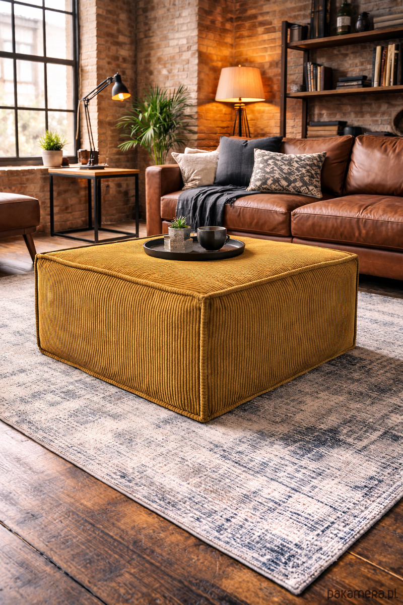 Jej prosta, geometryczna forma świetnie odnajduje się zarówno w salonie, sypialni, jak i przestrzeniach typu loft. Może pełnić funkcję dodatkowego siedziska, podnóżka lub nawet stolika kawowego.