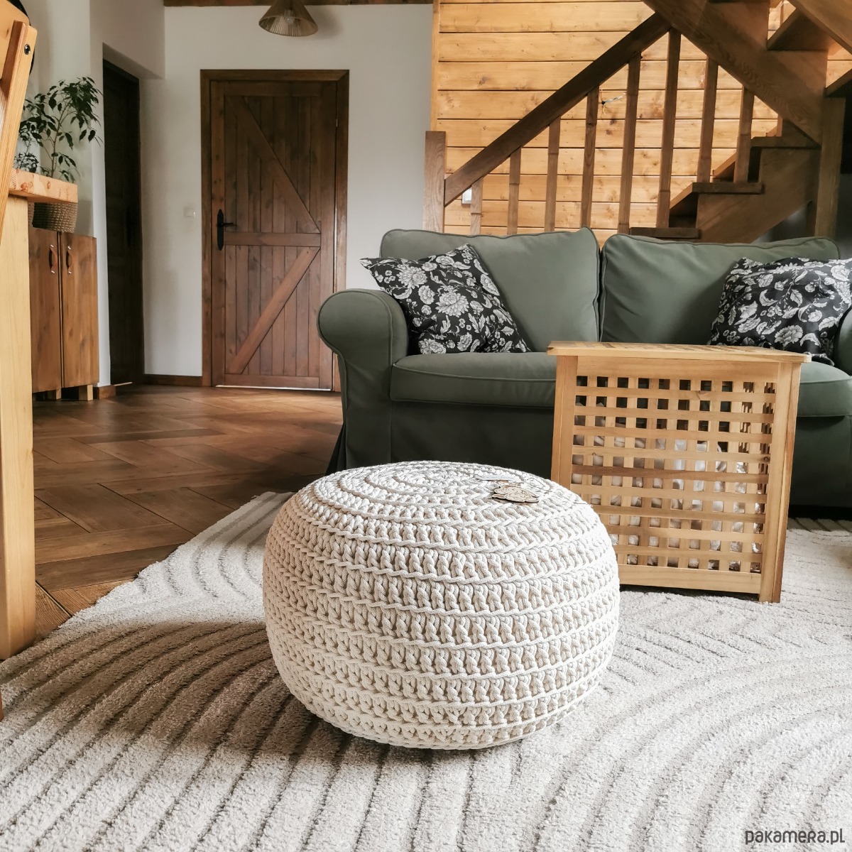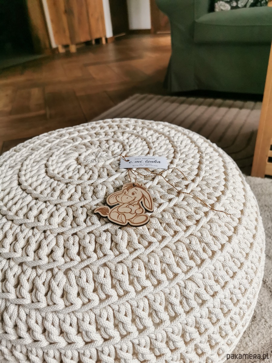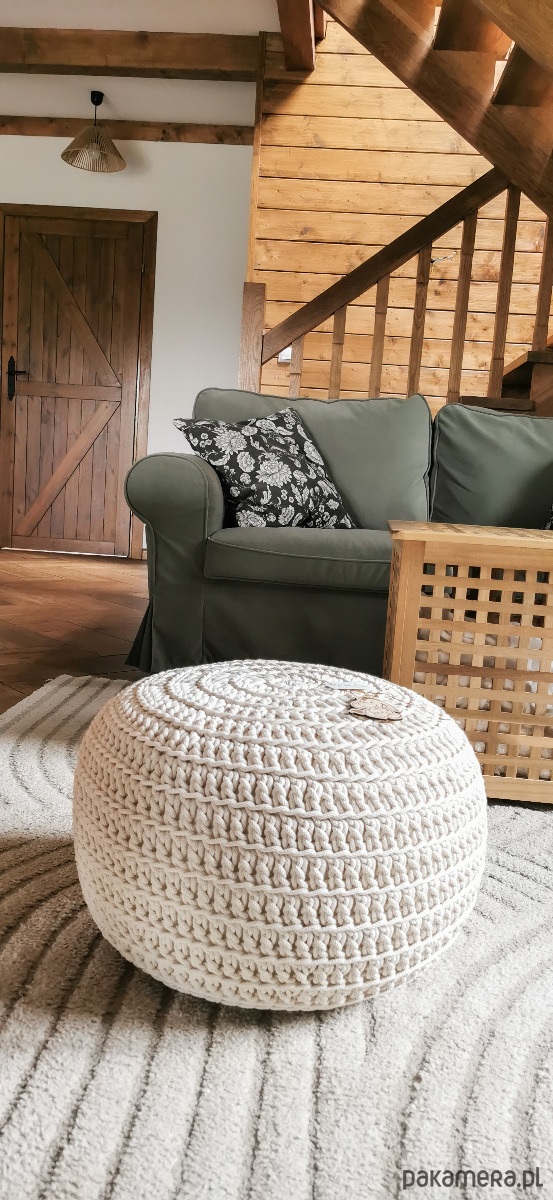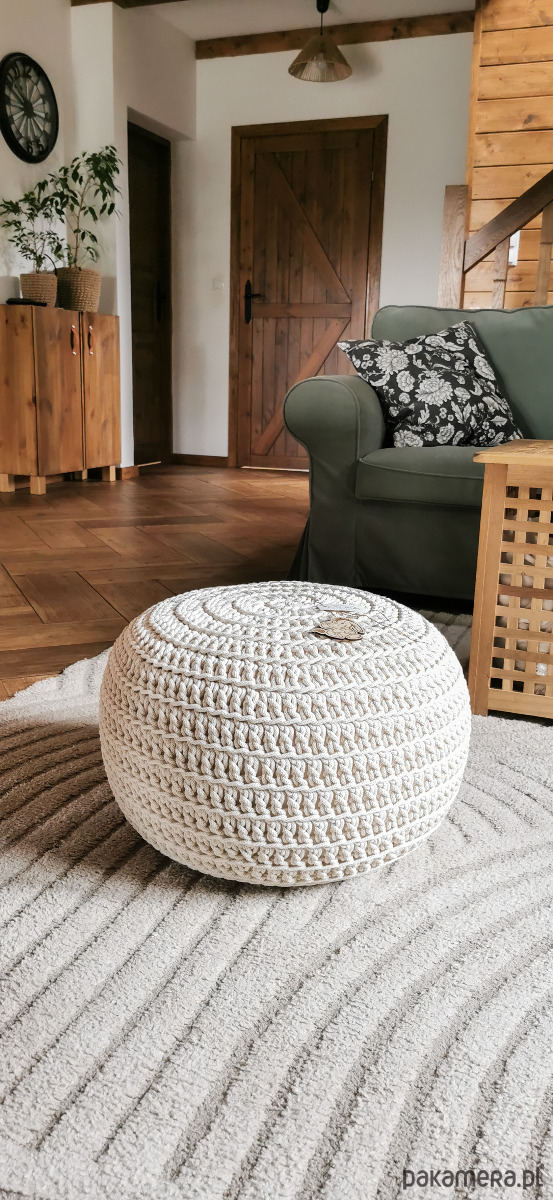 Ręcznie wykonany puf z grubego sznurka bawełnianego o średnicy 5mm.