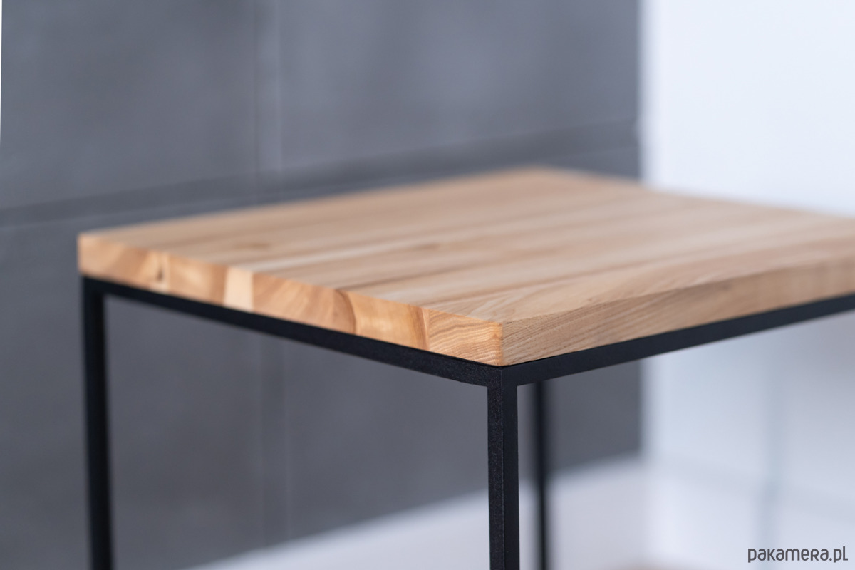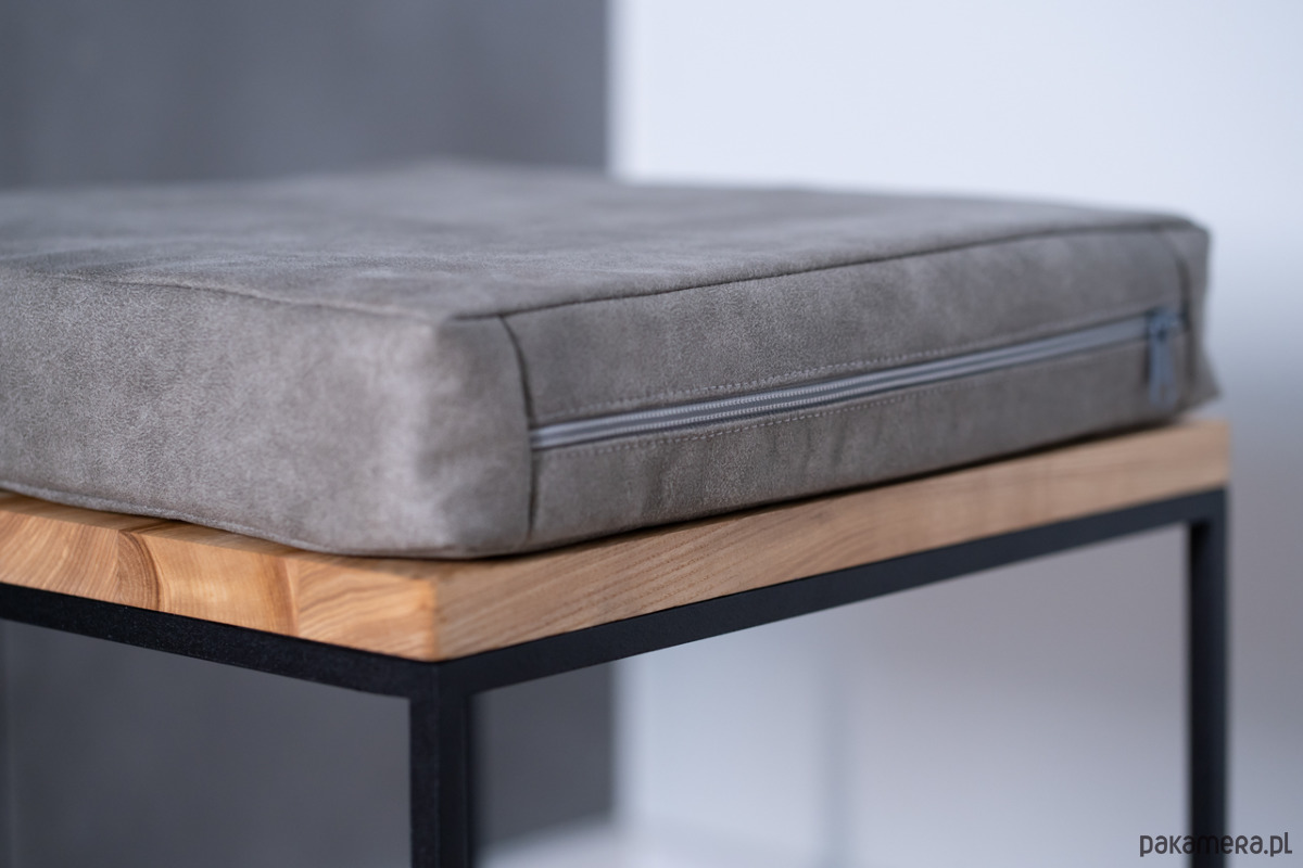 Blat wykonany został z płyty meblowej w kolorze dębu, konstrukcja ze stali malowanej proszkowo, zdejmowana poduszka z trudnopalnej, odpornej na ścieranie tkaniny.