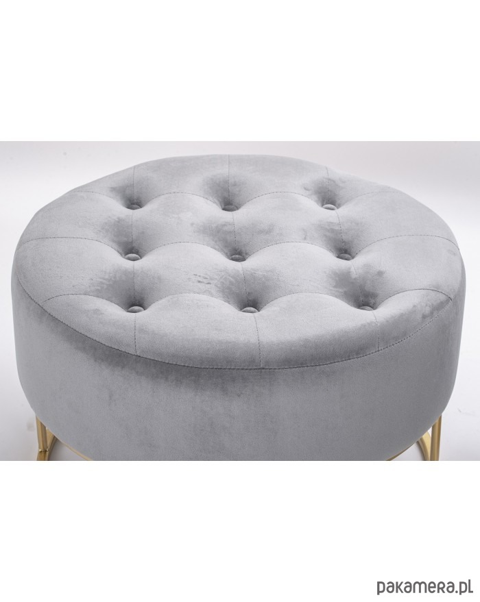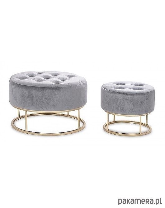 Komplet dwóch eleganckich siedzisk- puf. Podstawa jest metalowa, malowana proszkowo na kolor złoty. Siedzisko welurowe, pięknie pikowane i marszczone.