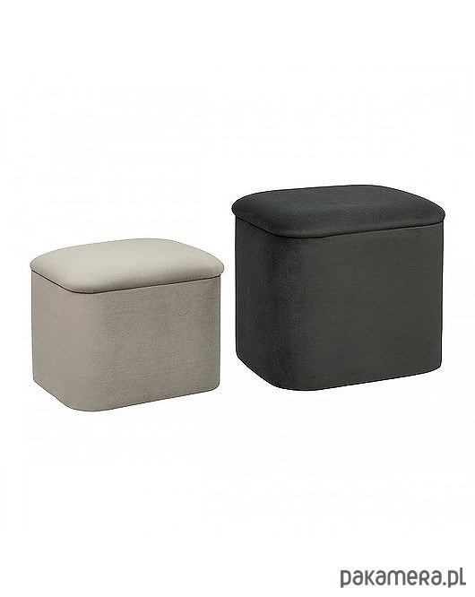 Komplet 2 puf wykonanych z MDFu z obiciem tkaniną welurową. Obie mają w sobie schowek przydatny w domu. Różnią się między sobą wielkością i kolorem. Większa jest ciemnoszara, mniejsza jaśniejsza. Mogą służyć nie tylko do siedzenia, ale również jako podnóżki.