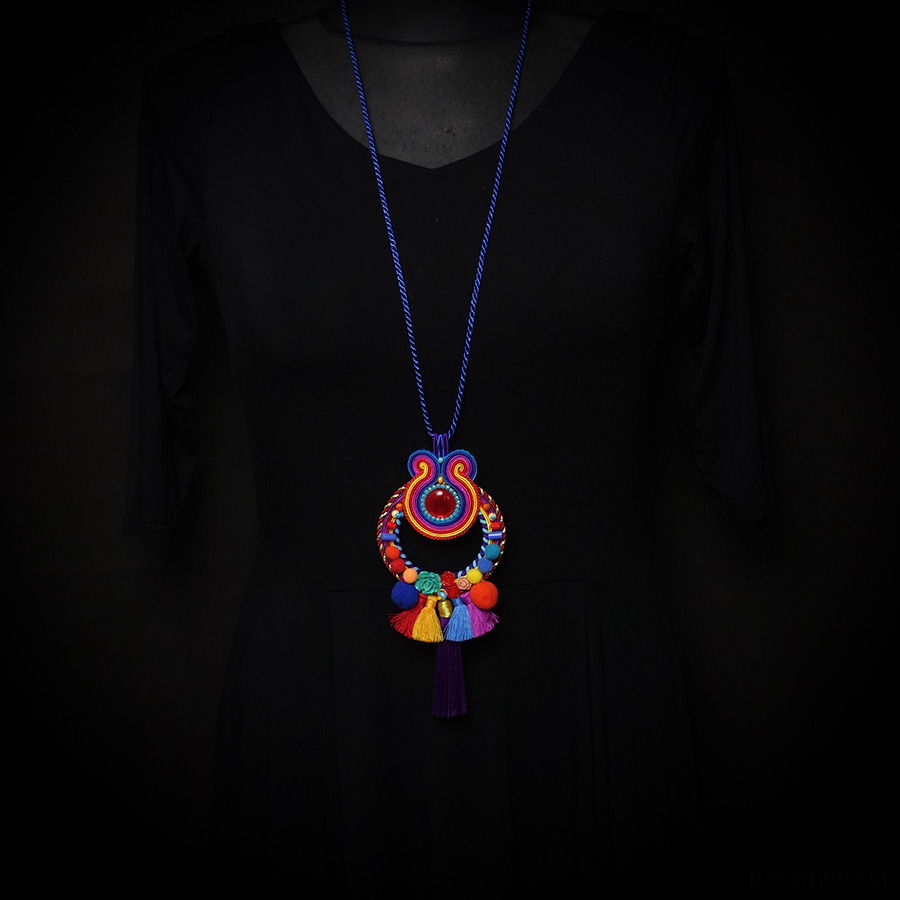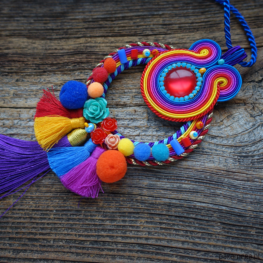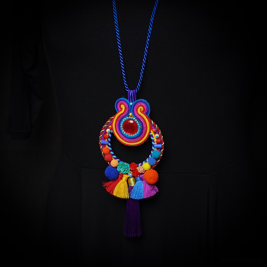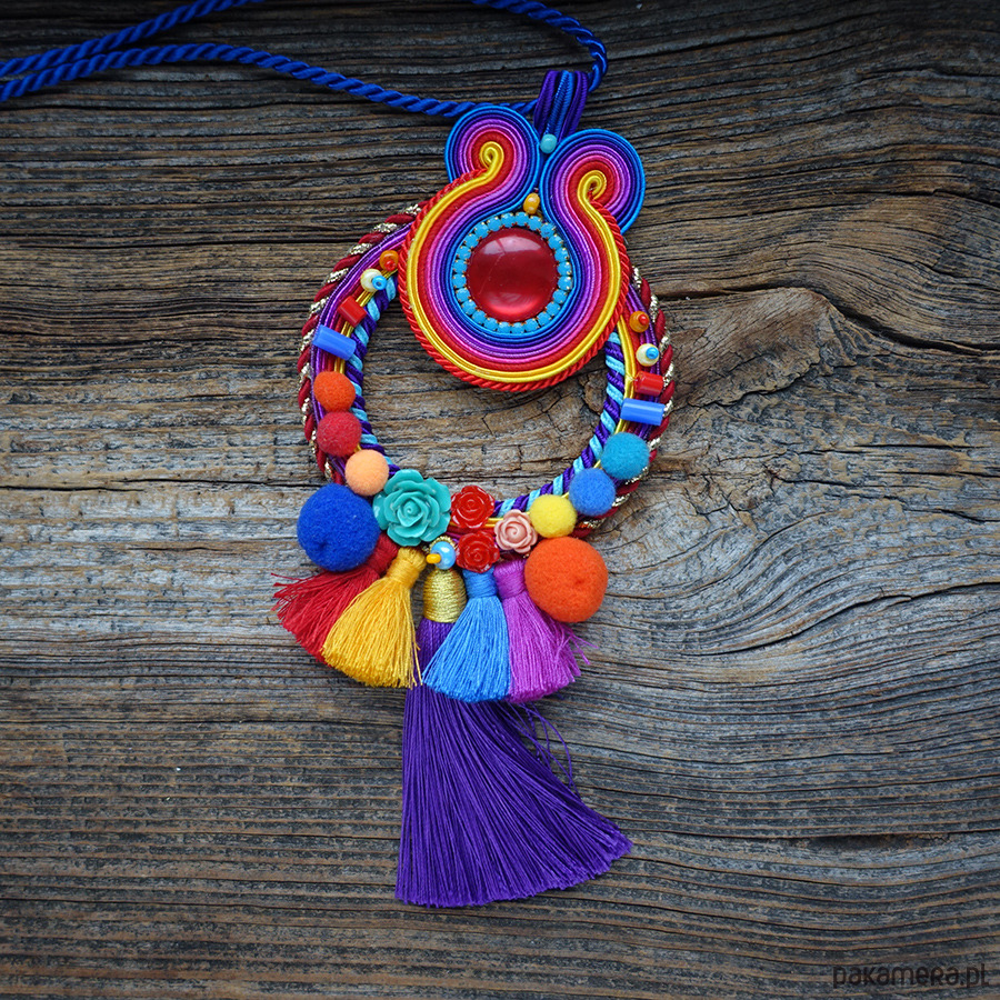 Wyrazisty, kolorowy wisior wykonany ręcznie metodą haftu soutache. Bogata kompozycja sznurków, koralików, pomponów i chwostów tworzy energetyczny, etniczny charakter biżuterii. To dodatek, który przyciąga uwagę i pięknie uzupełnia proste stylizacje.