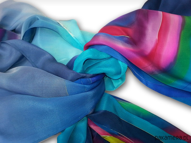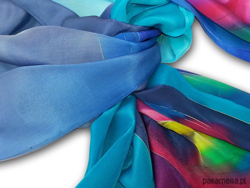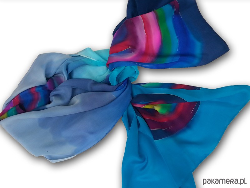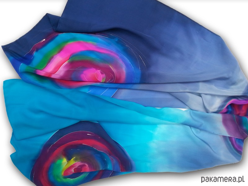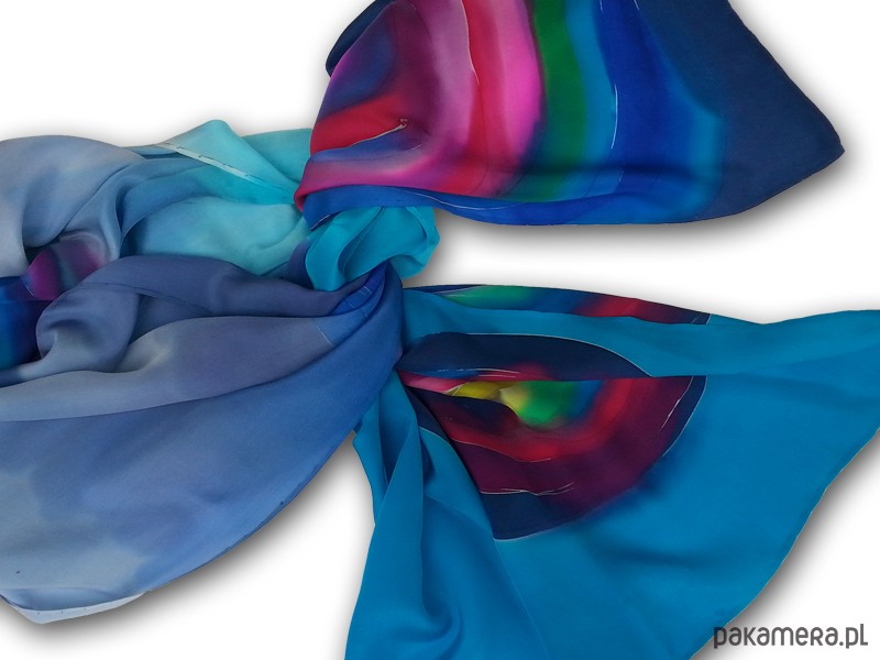 Delikatny, ręcznie malowany, jedwabny szal z motywem barwnych, pulsujących plam koloru na błękitnym tle.55x180 cm. Rysunek opracowany srebrną guttą.Całość namalowana na pięknie lejącej się krepie jedwabnej wysokiej jakości, ręcznie obszywanej. Jedwab utrwalany termicznie pod ciśnieniem, nie spiera się i nie płowieje, pranie ręczne, pozwalając cieszyć się pięknem szala przez długie lata. Naturalny jedwab, doskonały zarówno na jesienne i zimowe chłody, jak i letnie upały. Praca opatrzona jest certyfikatem pochodzenia/autentyczności, uzupełnionym o przepis prania. Całość zamyka się w pięknym opakowaniu z ozdobnego kartonu, przepasanym rafią/wstążką. Moje prace powstają prawie wyłącznie na zamówienie, dlatego można zamówić każdy ze wzorów w ulubionej, wybranej kolorystyce. Sprzedając moje szale, sprzedaję marzenia. Słowem; idealny, wyszukany i elegancki prezent dla pięknej kobiety, ceniącej to to jednostkowe i niepowtarzalne.