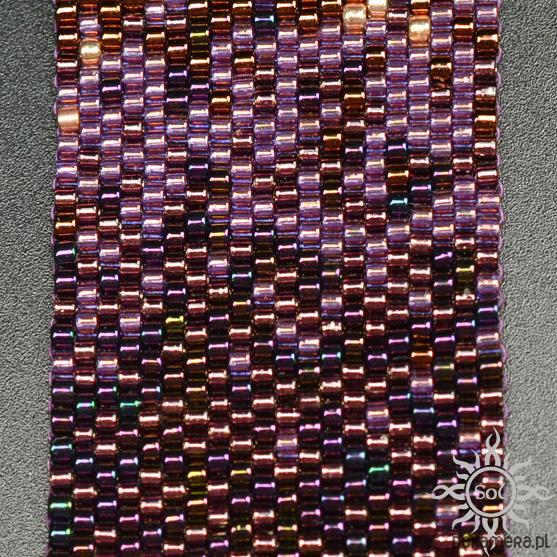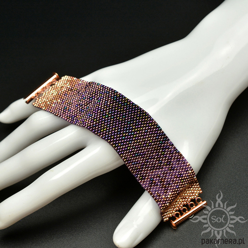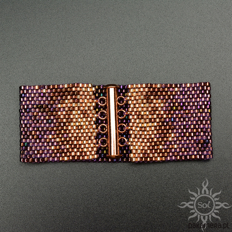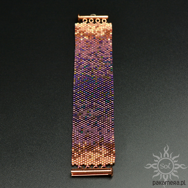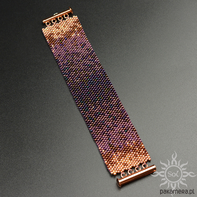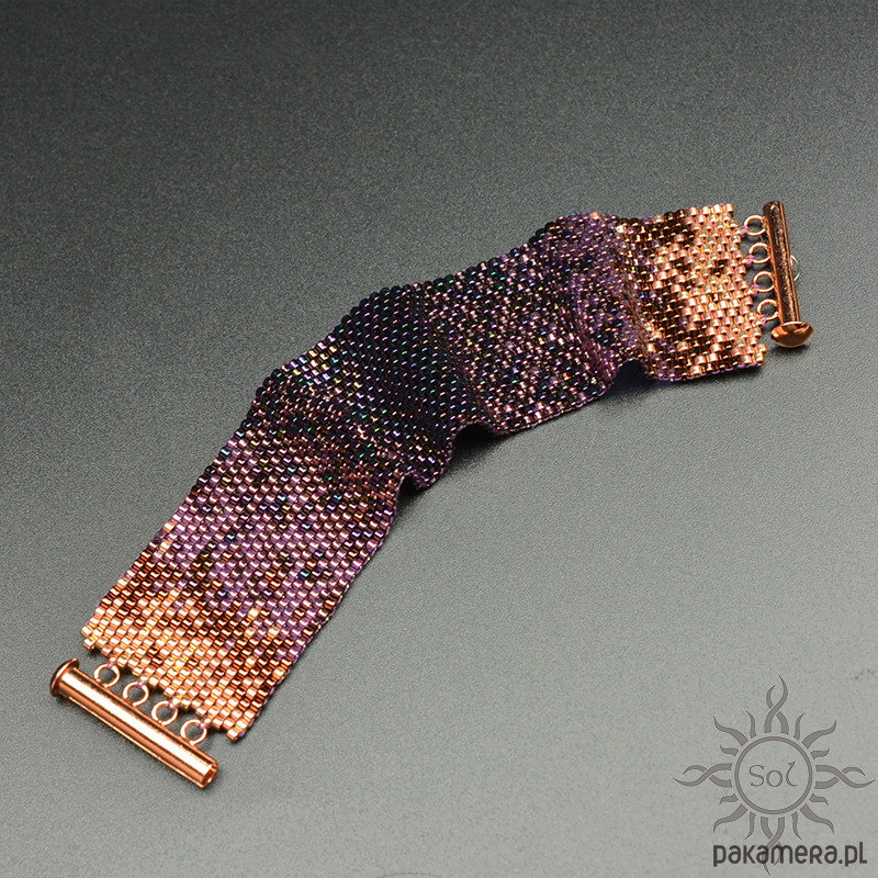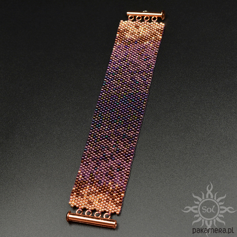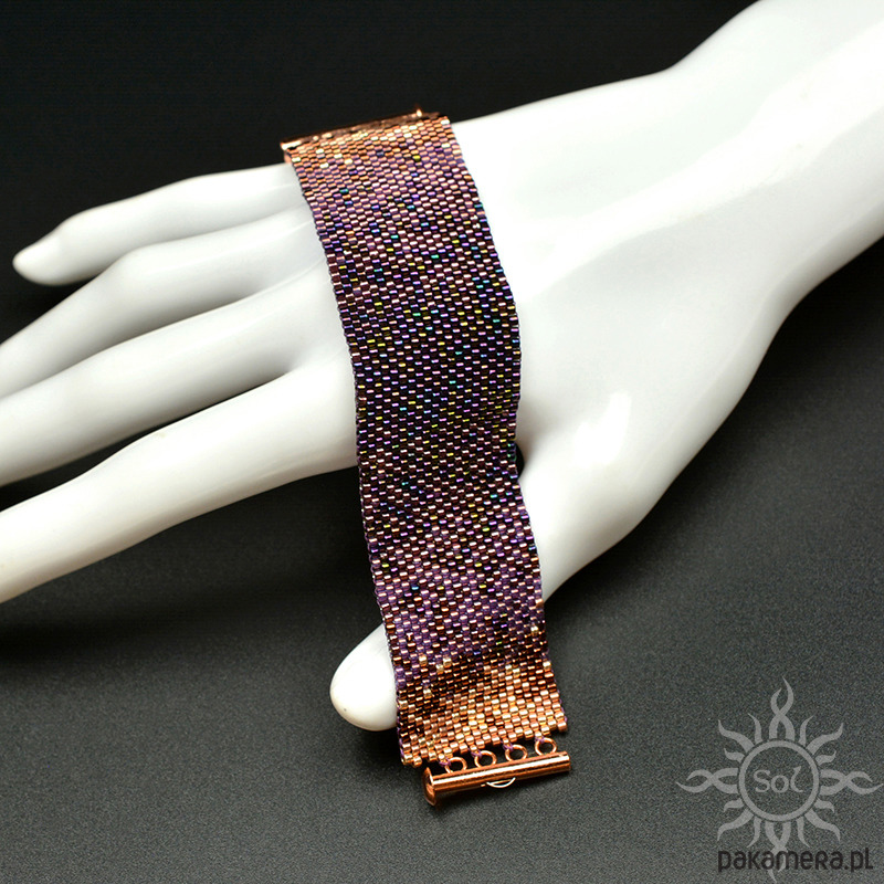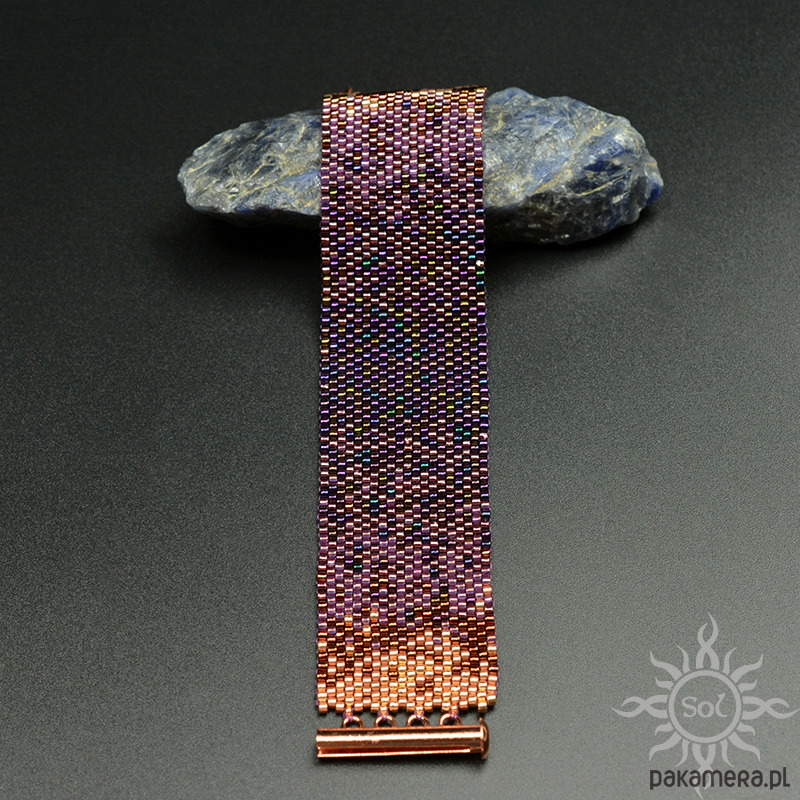 Bransoleta wypleciona niezwykle czasochłonną techniką beadingu z najwyższej jakości japońskich koralików Toho Treasures i Miyuki Delica w odcieniach fioletu i różowego złota/miedzi.