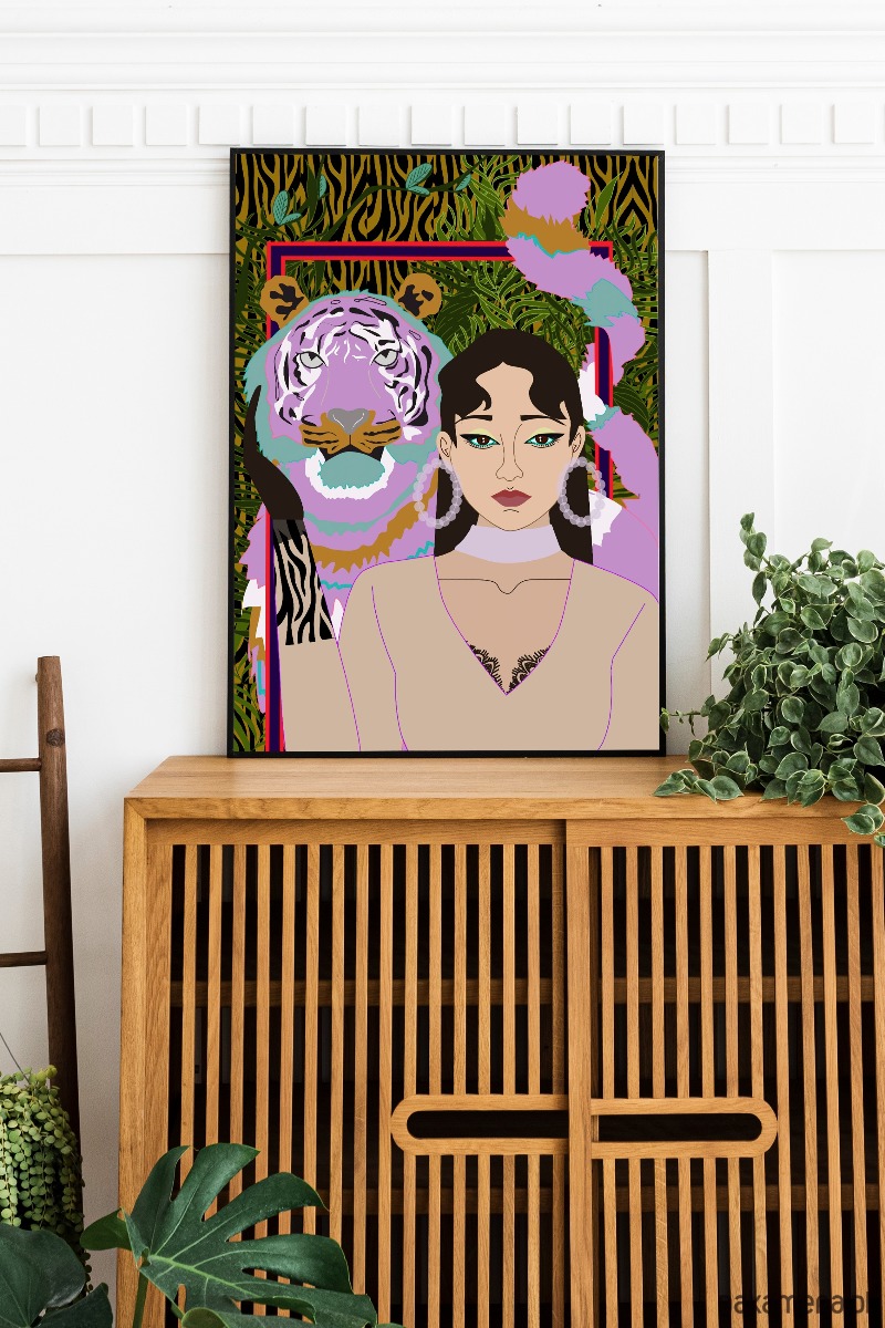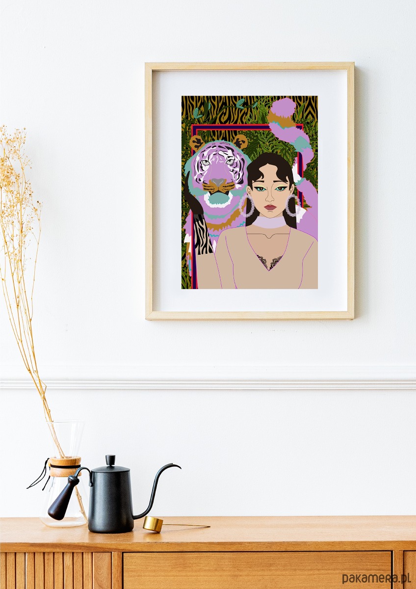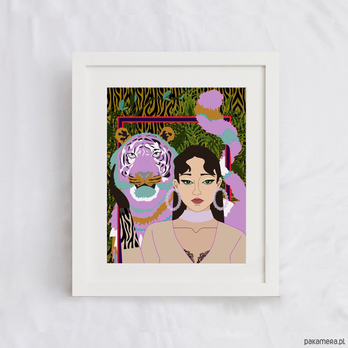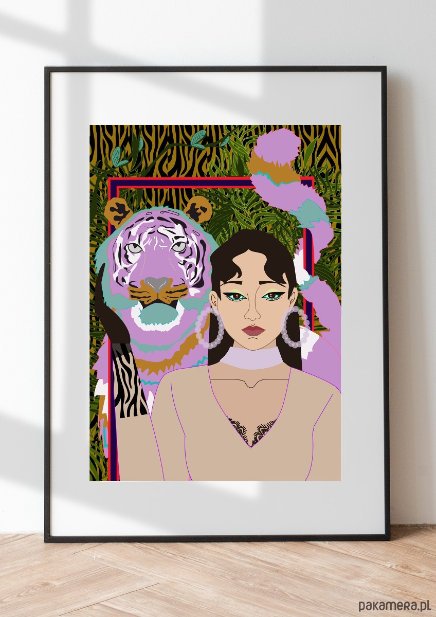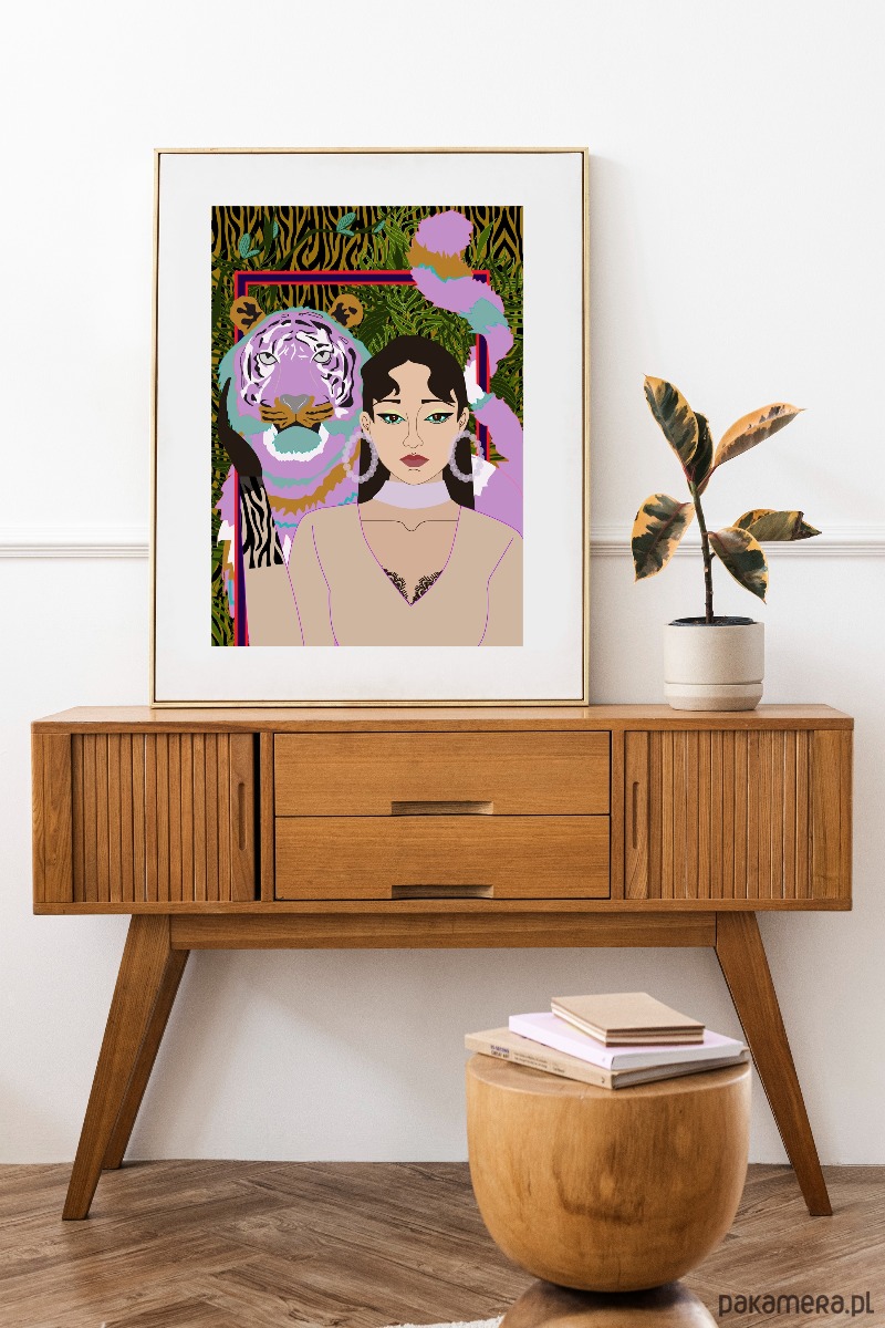 Piękna ilustracja na ścianę przedstawiająca kobietę i tygrysa. Plakat kolorowy, żywe kolory idealny do nowoczesnych i kolorowych wnętrz.