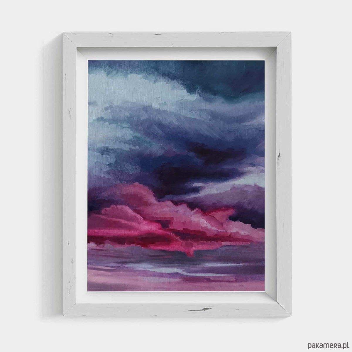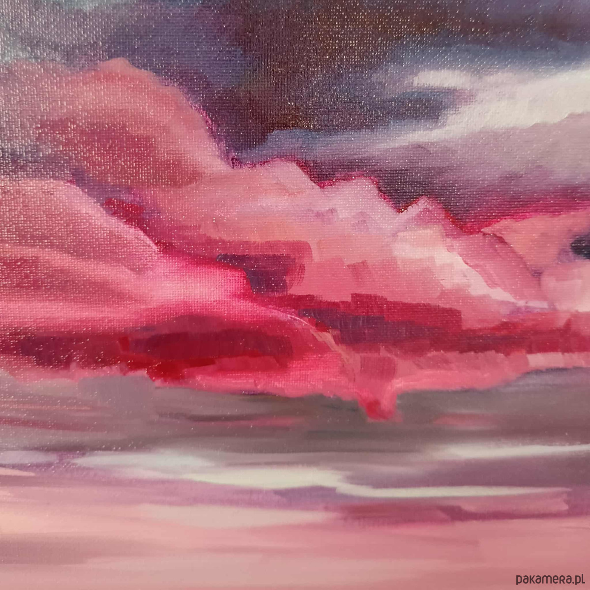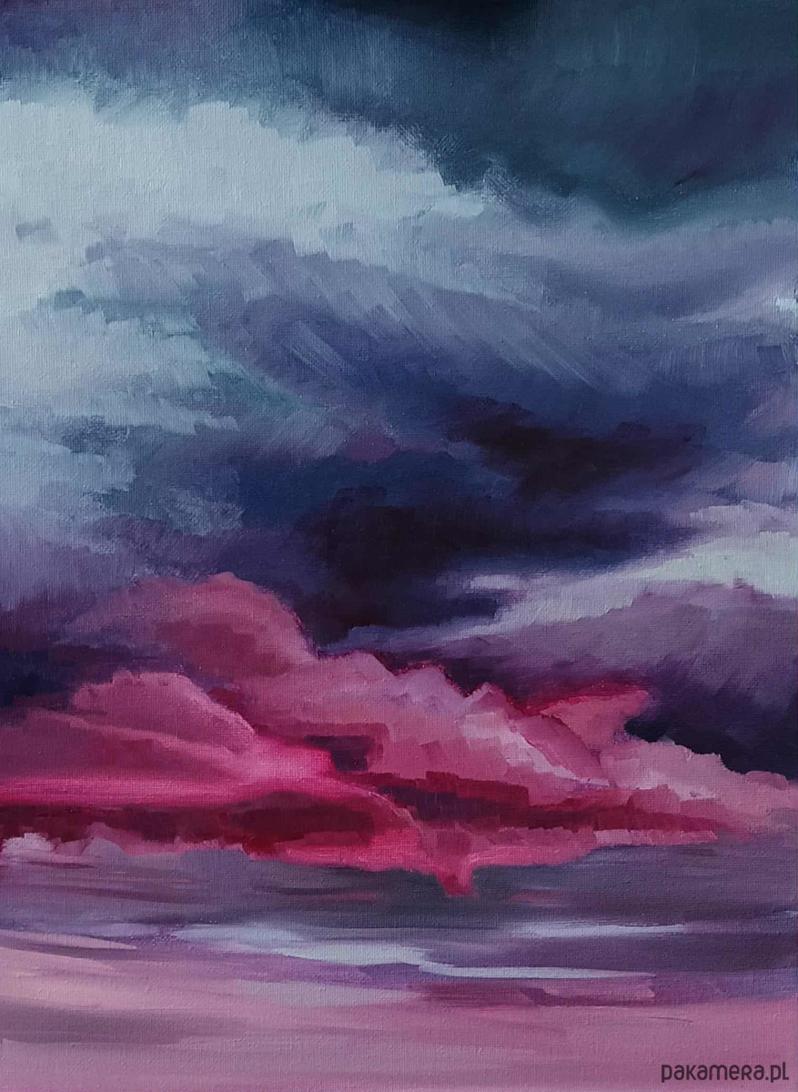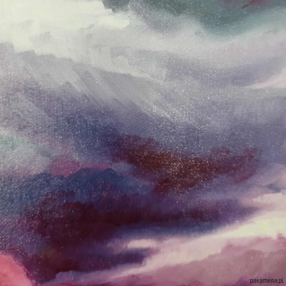 "Purpurowe niebo" to oryginalny obraz olejny przedstawiający zachód słońca.