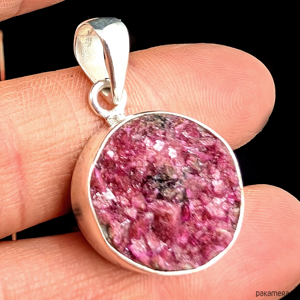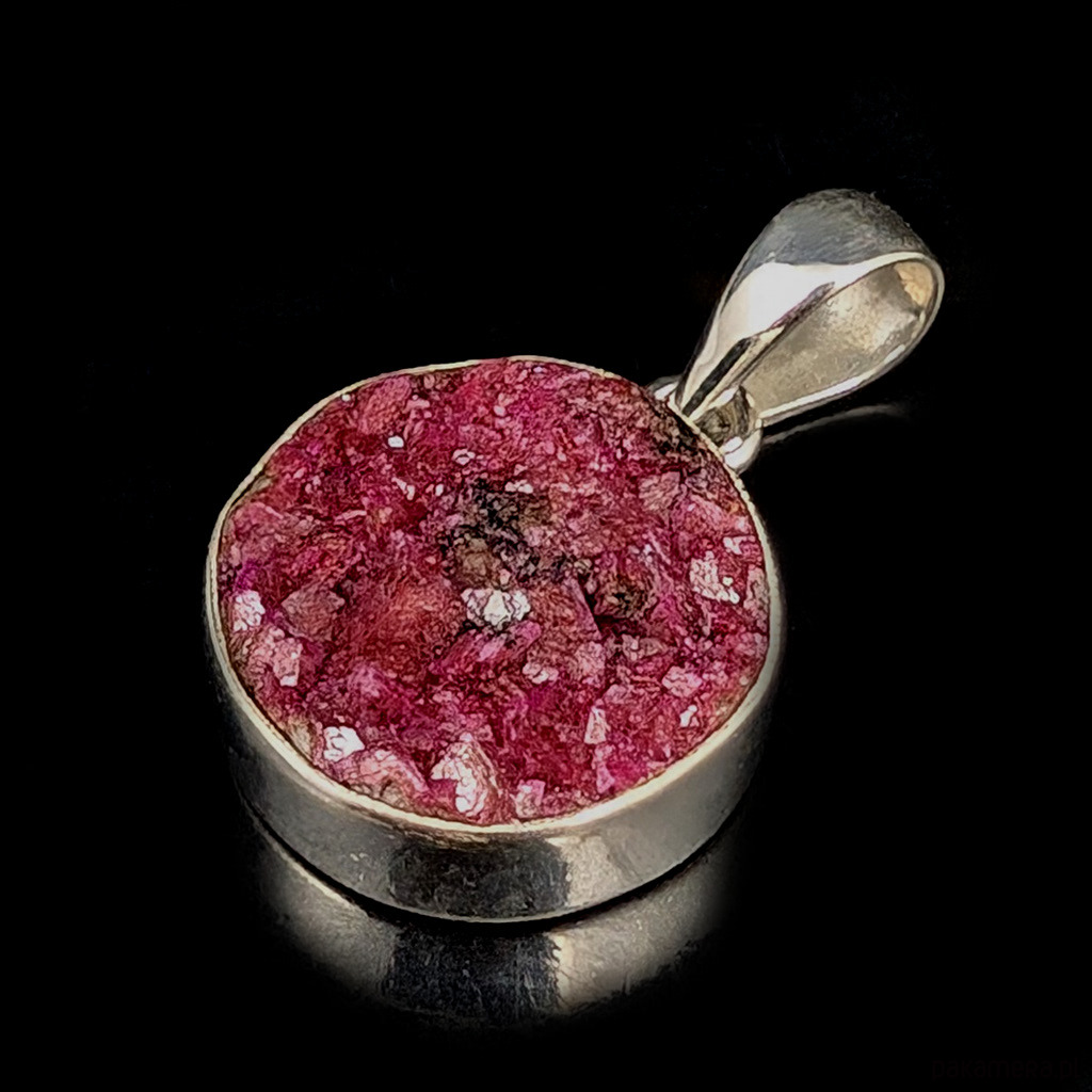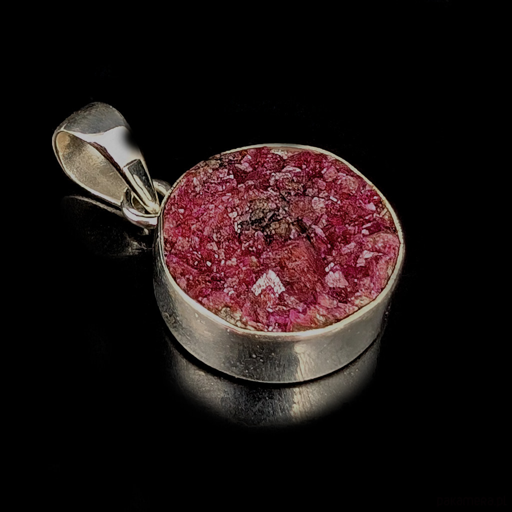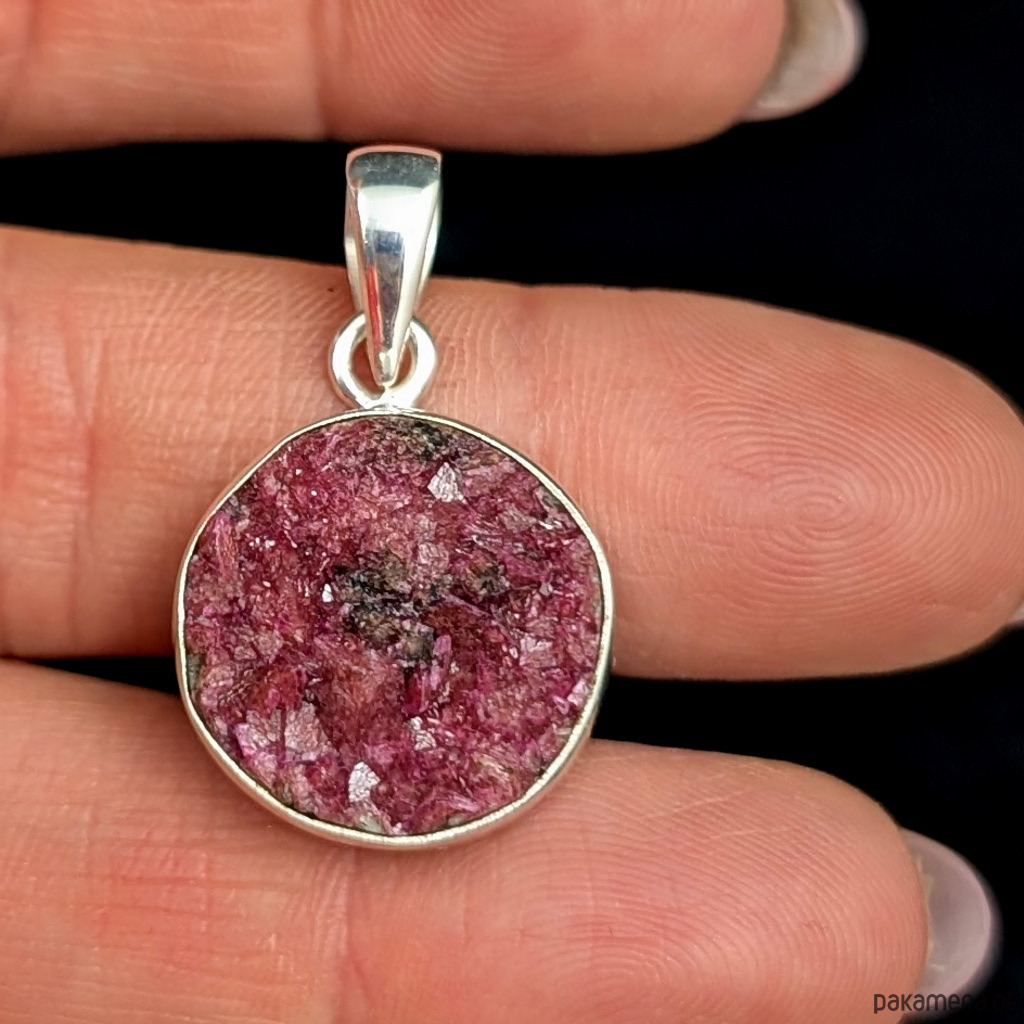 Wisiorek z oprawionym w srebro próby 925 intensywnie różowym kobaltokalcytem o pięknie wykształconych kryształach. Kamień ma oprawę 18 mm. Długość 31 mm. 6 g. Wykonany przez dostawcę kamieni. Zapakowany zostanie w ozdobne pudełeczko.