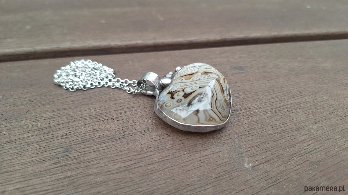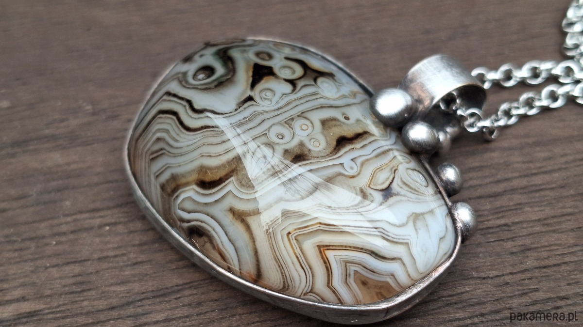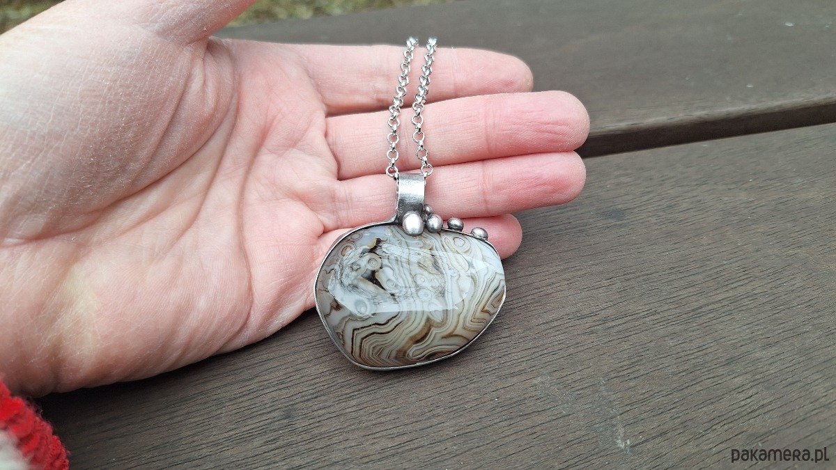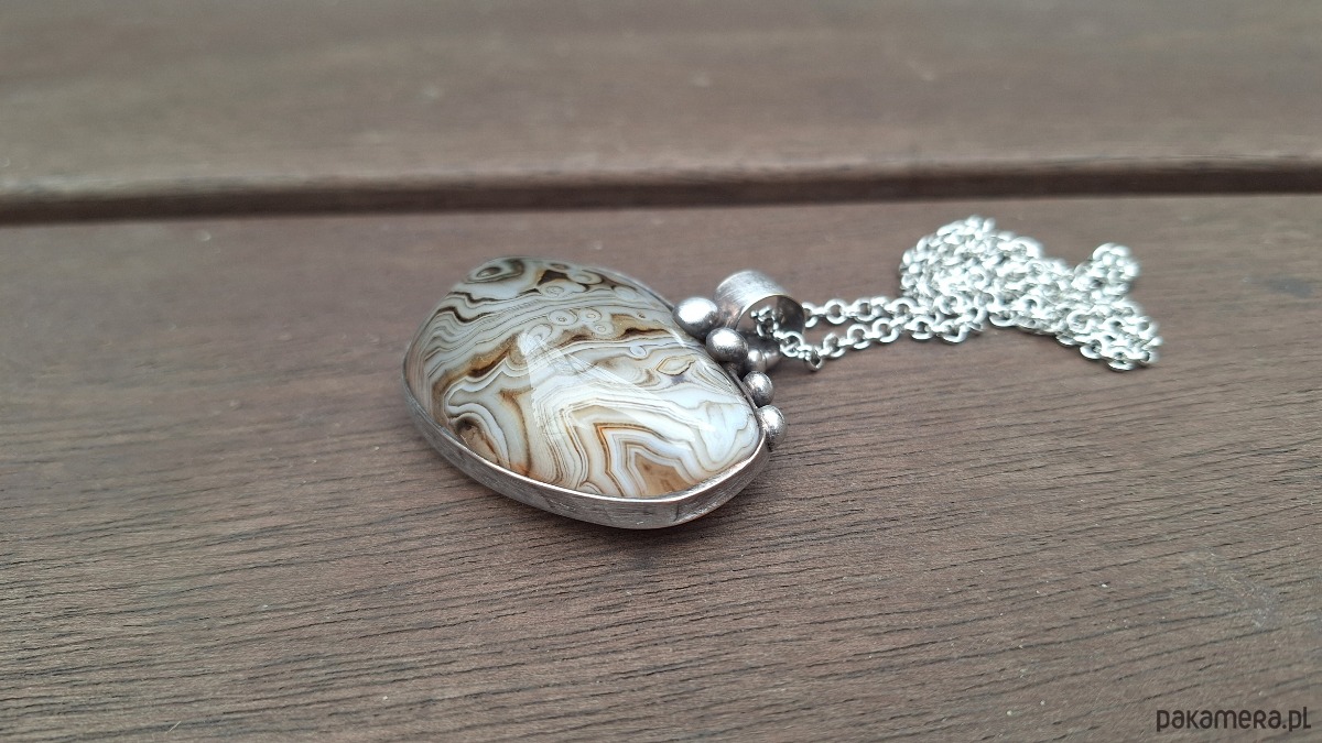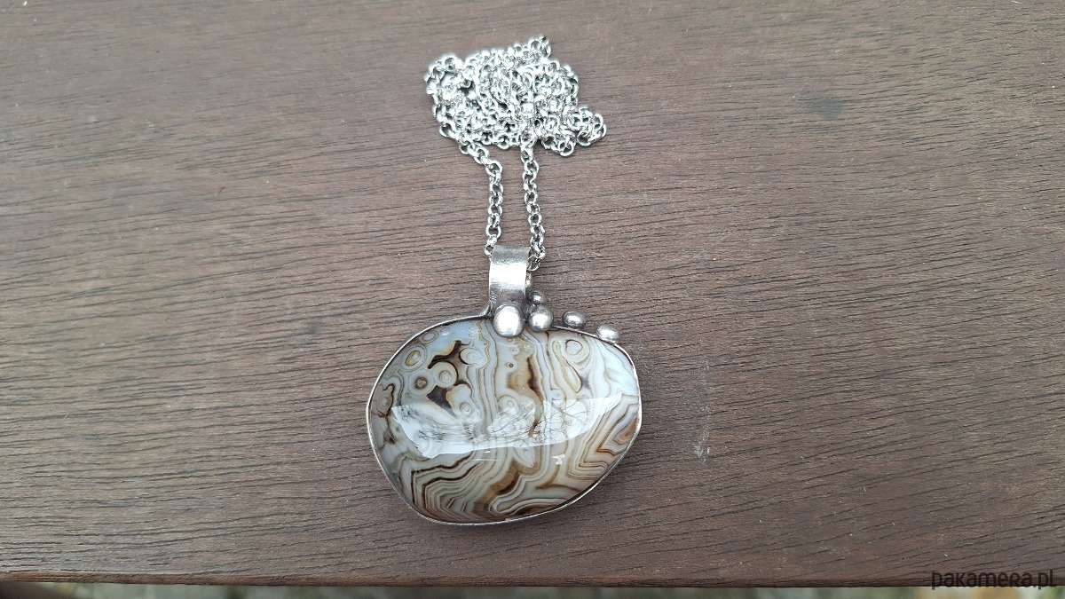 Wisiorek wykonany z miedzi, cyny i naturalnego agatu. Wymiary ok. 4 na 4.5 cm. Zawieszony na łańcuszku o długości ok. 50 cm.