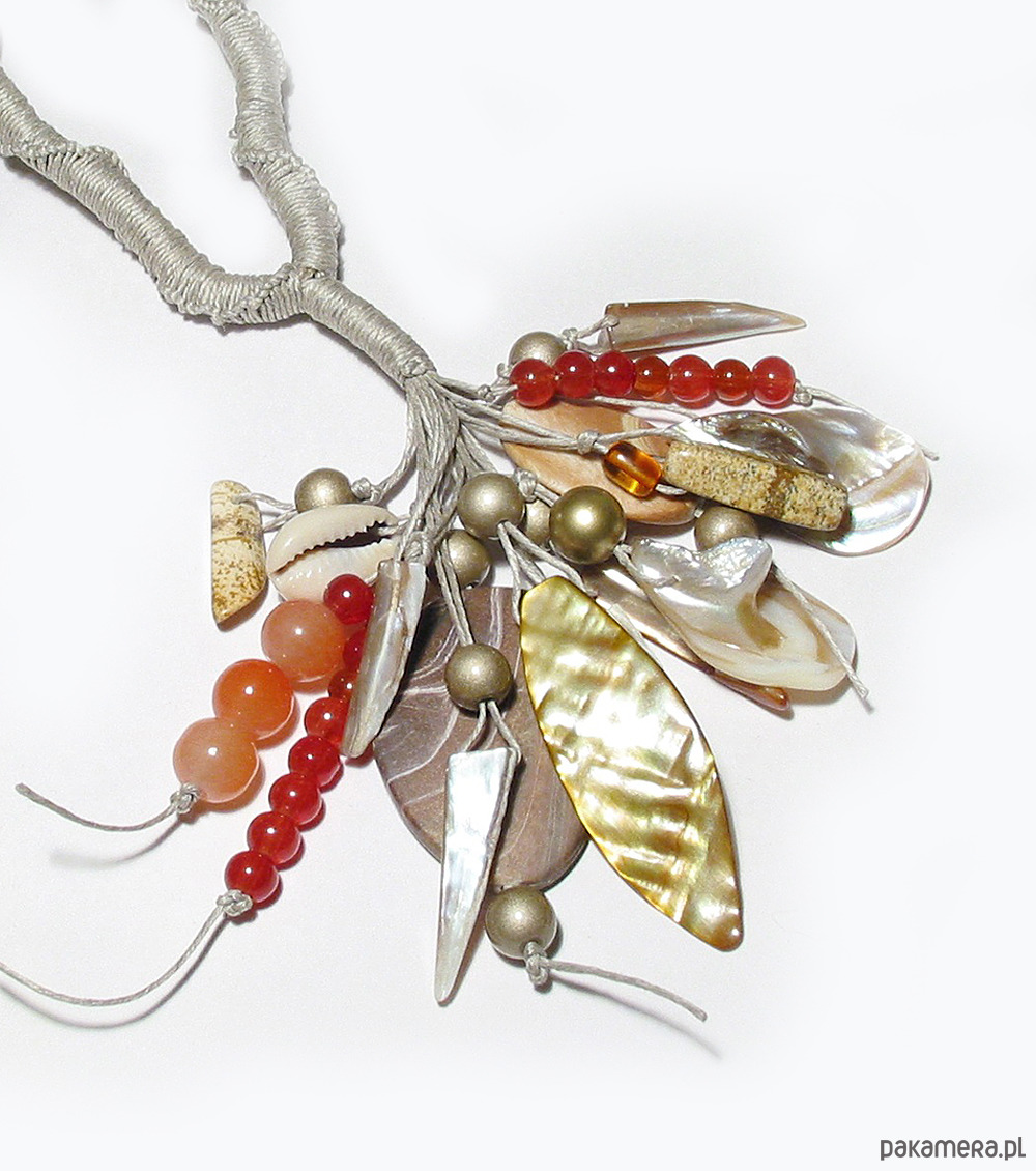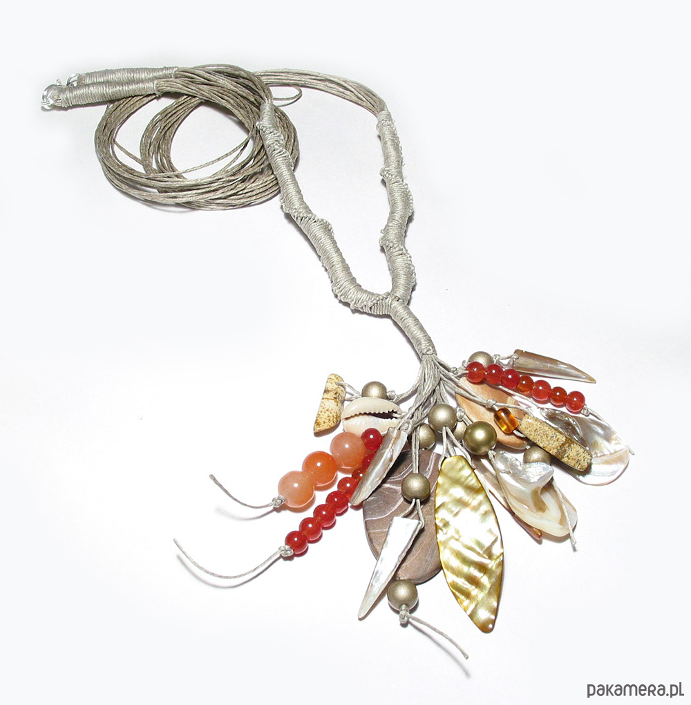 Wisior wypleciony na naturalnej przędzy lnianej. Powstał z elementów szklanych, akrylowych, muszli, masy perłowej i jaspisów.