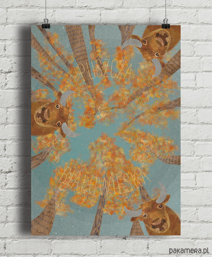 Puszcza Białowieska jest jednym z najpiękniejszych miejsc w Polsce, pełnym dzikiej przyrody i największym skupiskiem żyjących wolno żubrów na świecie. Na naszym plakacie trzy żubry w otoczeniu jesiennych drzew spoglądają z góry na patrzącego.