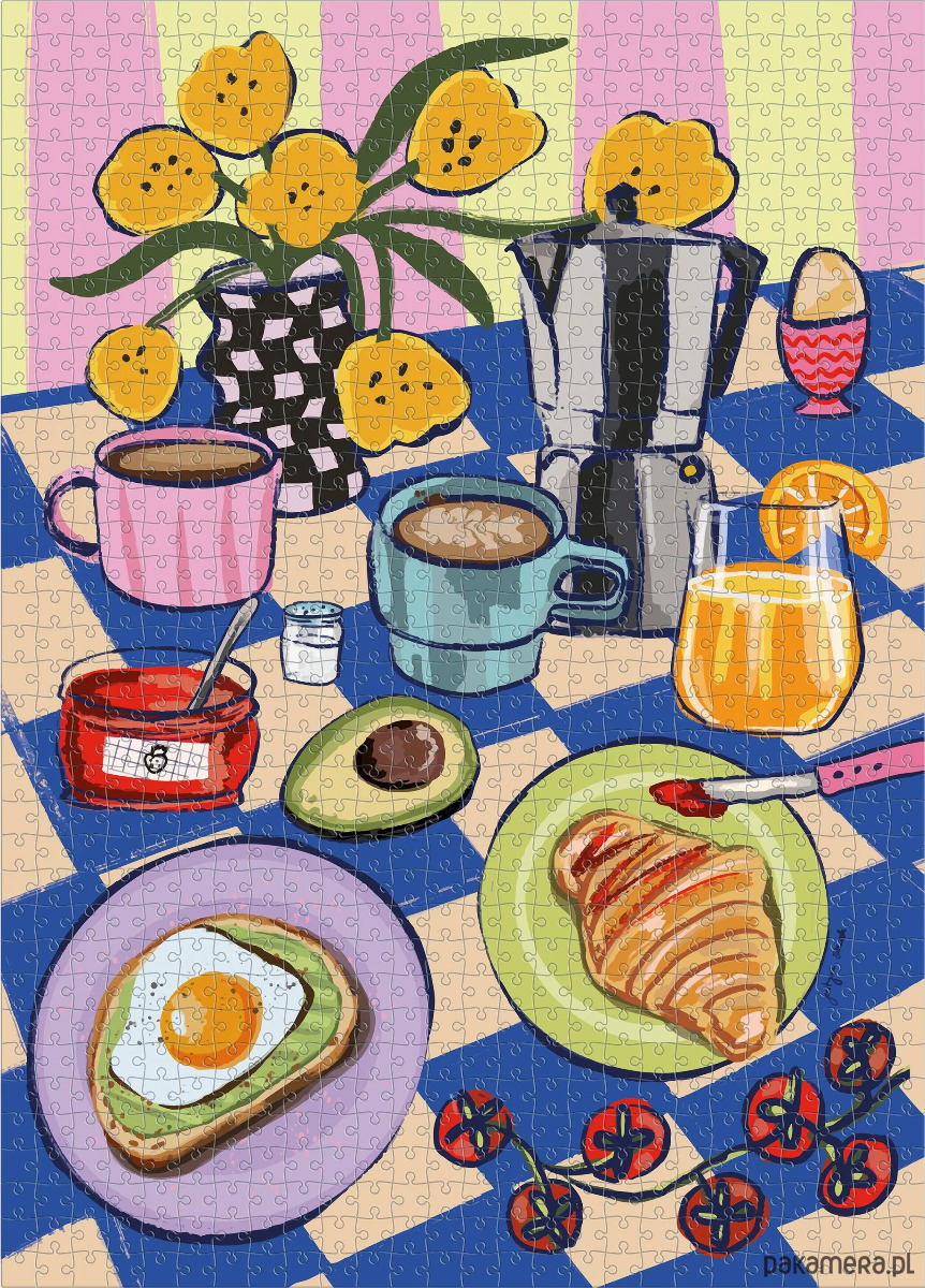 Puzzle 1000 „Slow Morning” by Justyna Łaciok to doskonały sposób na rozpoczęcie dnia w najlepszy możliwy sposób. Wyobraź sobie delikatny tost z awokado, chrupiący croissant i filiżankę aromatycznej kawy — to wszystko tworzy spójną kompozycję pełną smaku i kolorów.