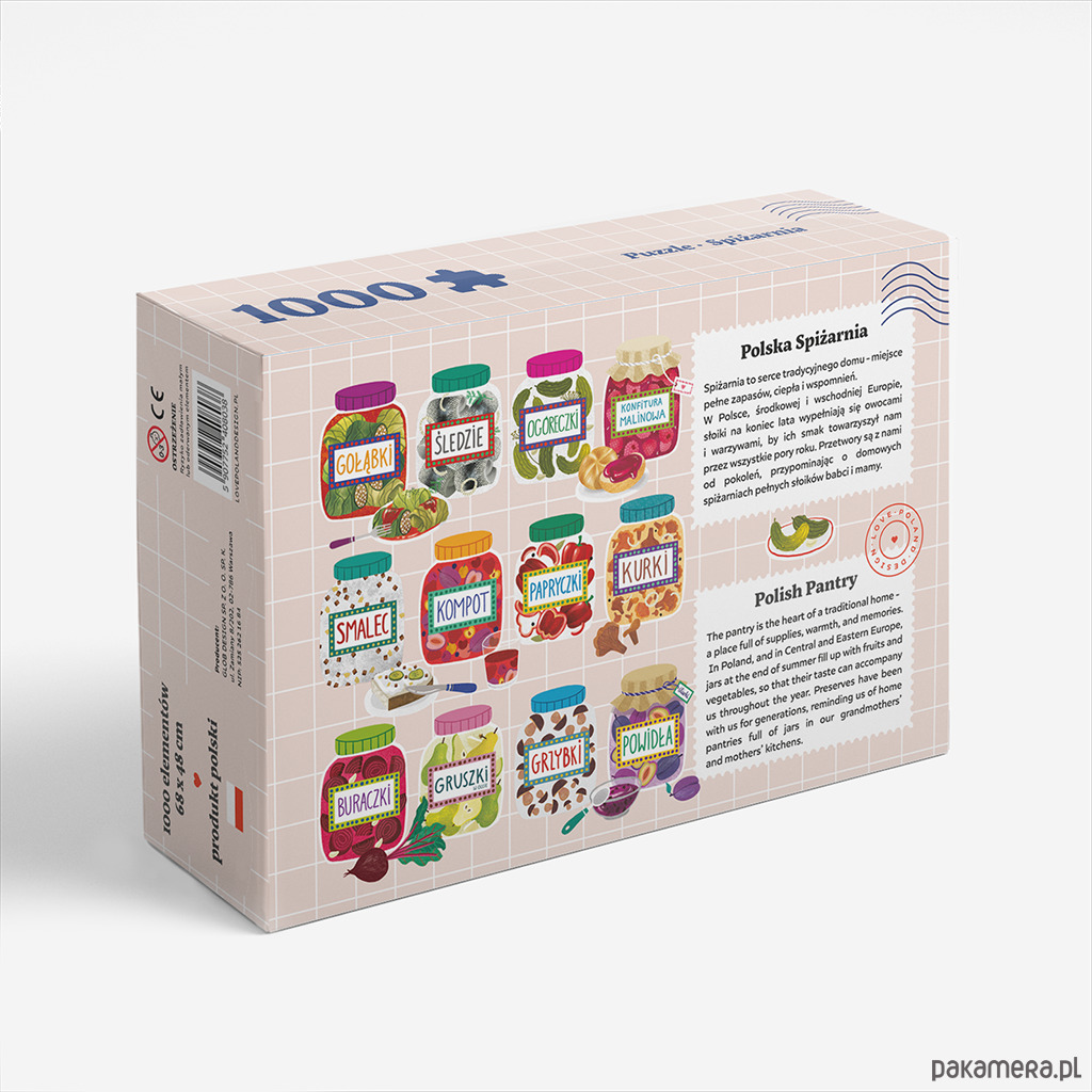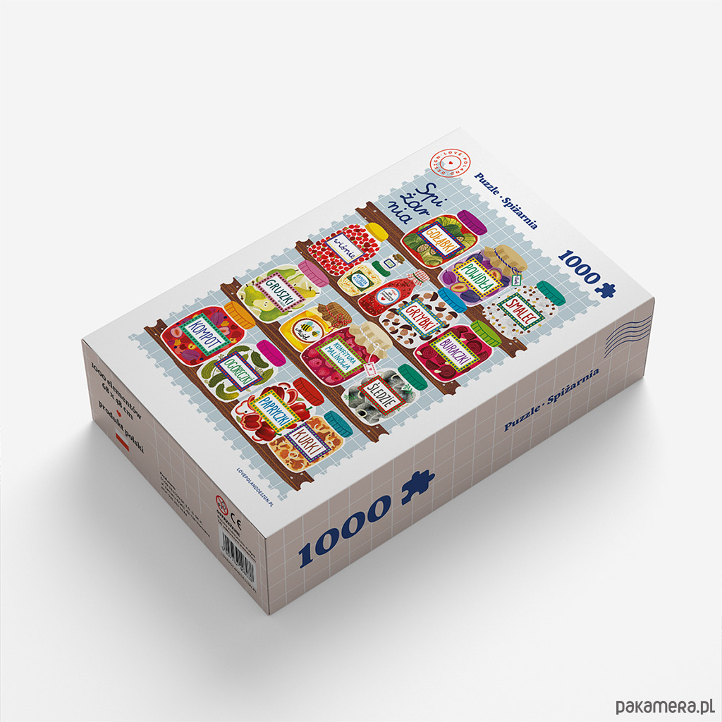 Puzzle z naszą autorską grafiką spiżarni to doskonała propozycja dla miłośników polskiej kuchni! Puzzle mają 1000 elementów, a ich wymiary po ułożeniu to 68x48cm. Zaprojektowane i wyprodukowane w Polsce, jak wszystkie nasze produkty.