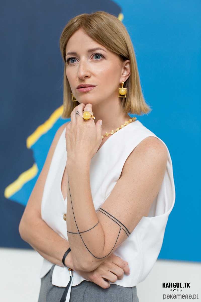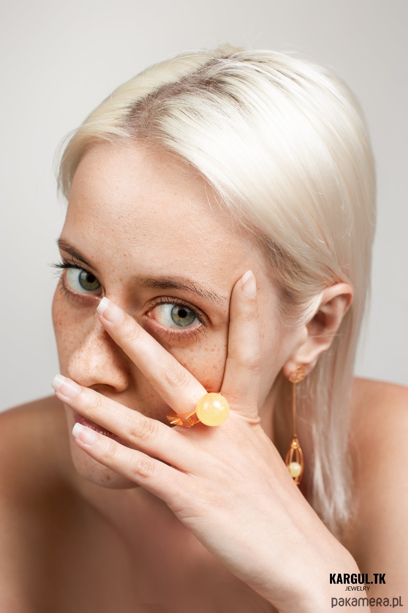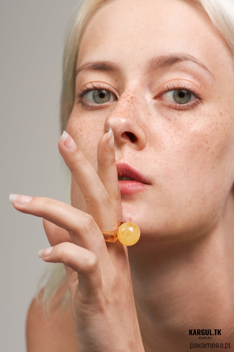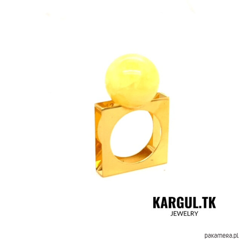 Pierścionek z kolekcji QLKA , minimalistyczna srebrna konstrukcja z monumentalną kulą bursztynu w kolorze żółtym,