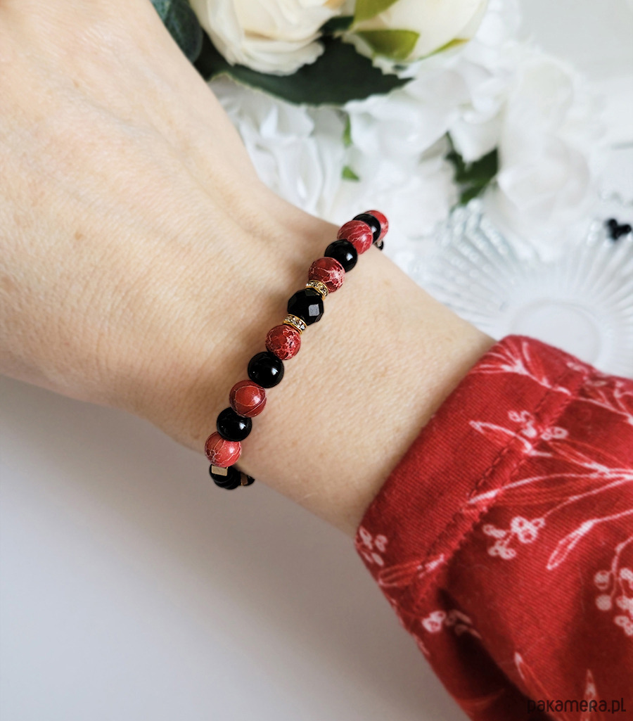 Przepiękna bransoletka z kolekcji "Queen of dark z turmalinem" zrobiona z kamieni naturalnych: Turmalinu, Onyksu, Jaspisu cesarskiego oraz Hematytu w kolorze złota.