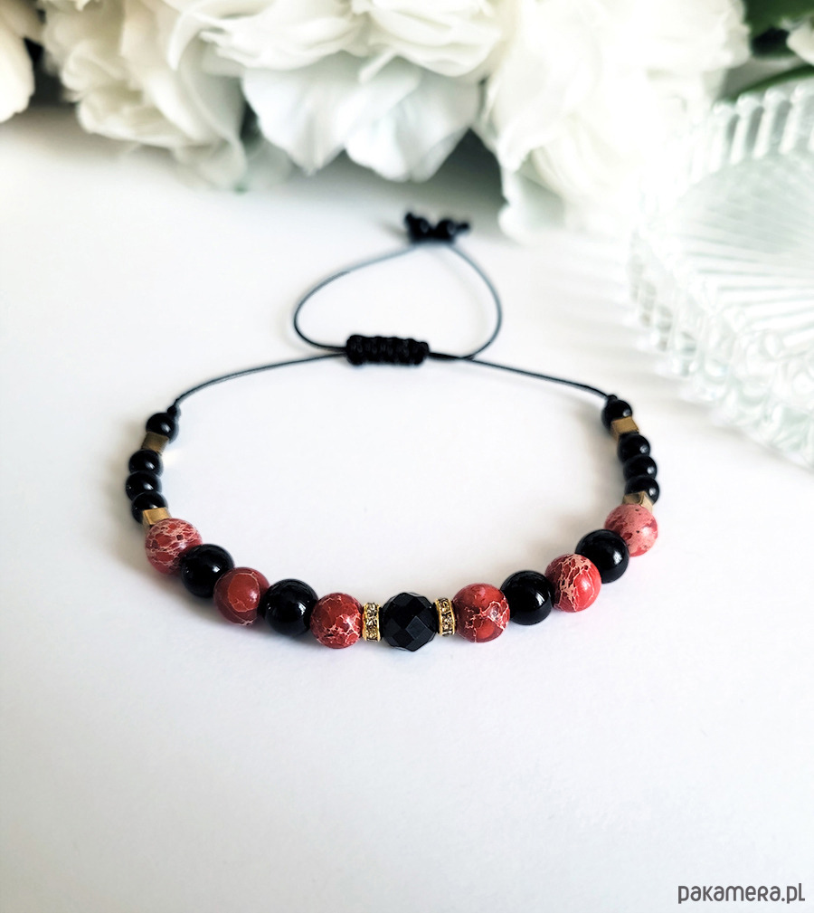 Przepiękna bransoletka z kolekcji "Queen of dark z turmalinem" zrobiona z kamieni naturalnych: Turmalinu, Onyksu, Jaspisu cesarskiego oraz Hematytu w kolorze złota.