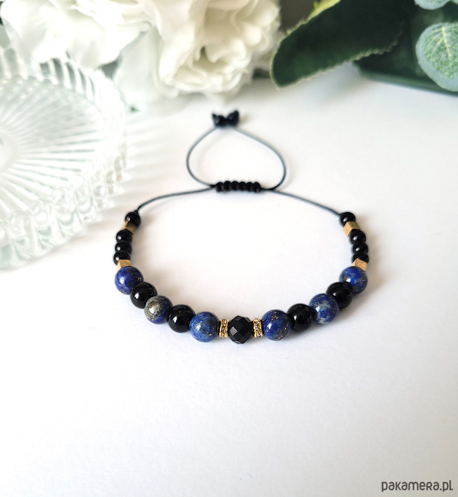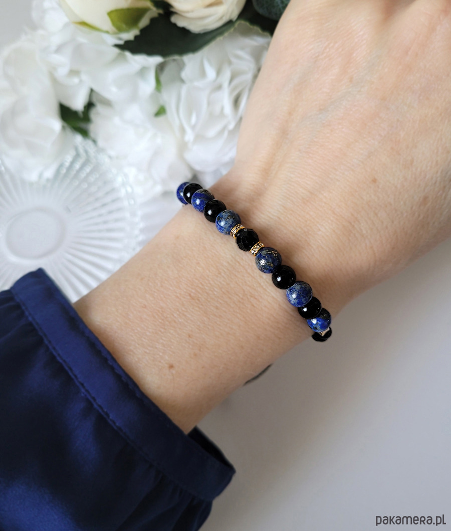 Przepiękna bransoletka z kolekcji "Queen of dark z turmalinem" zrobiona z kamieni naturalnych: Turmalinu, Onyksu, Lapisu lazuli oraz Hematytu w kolorze złota.