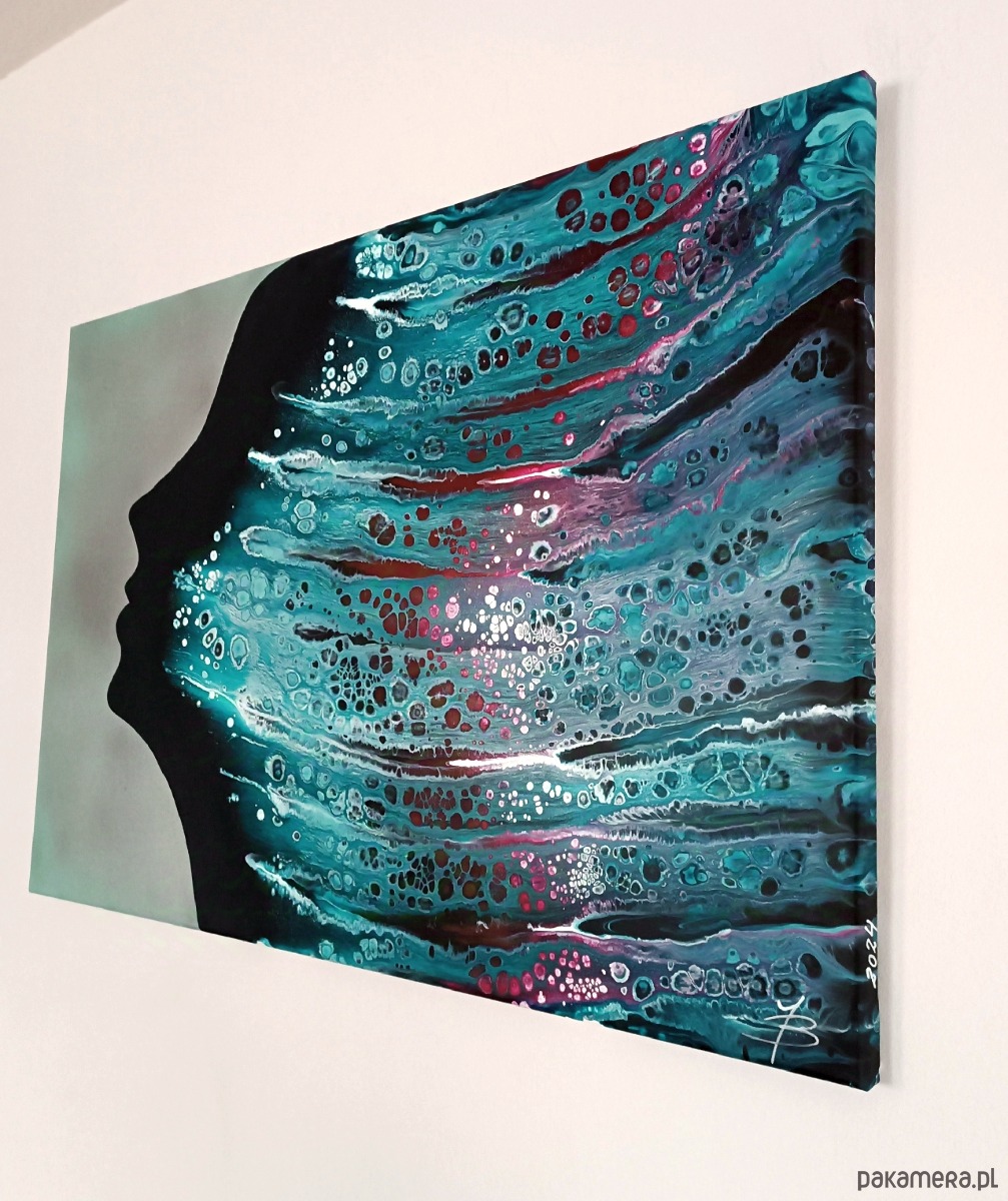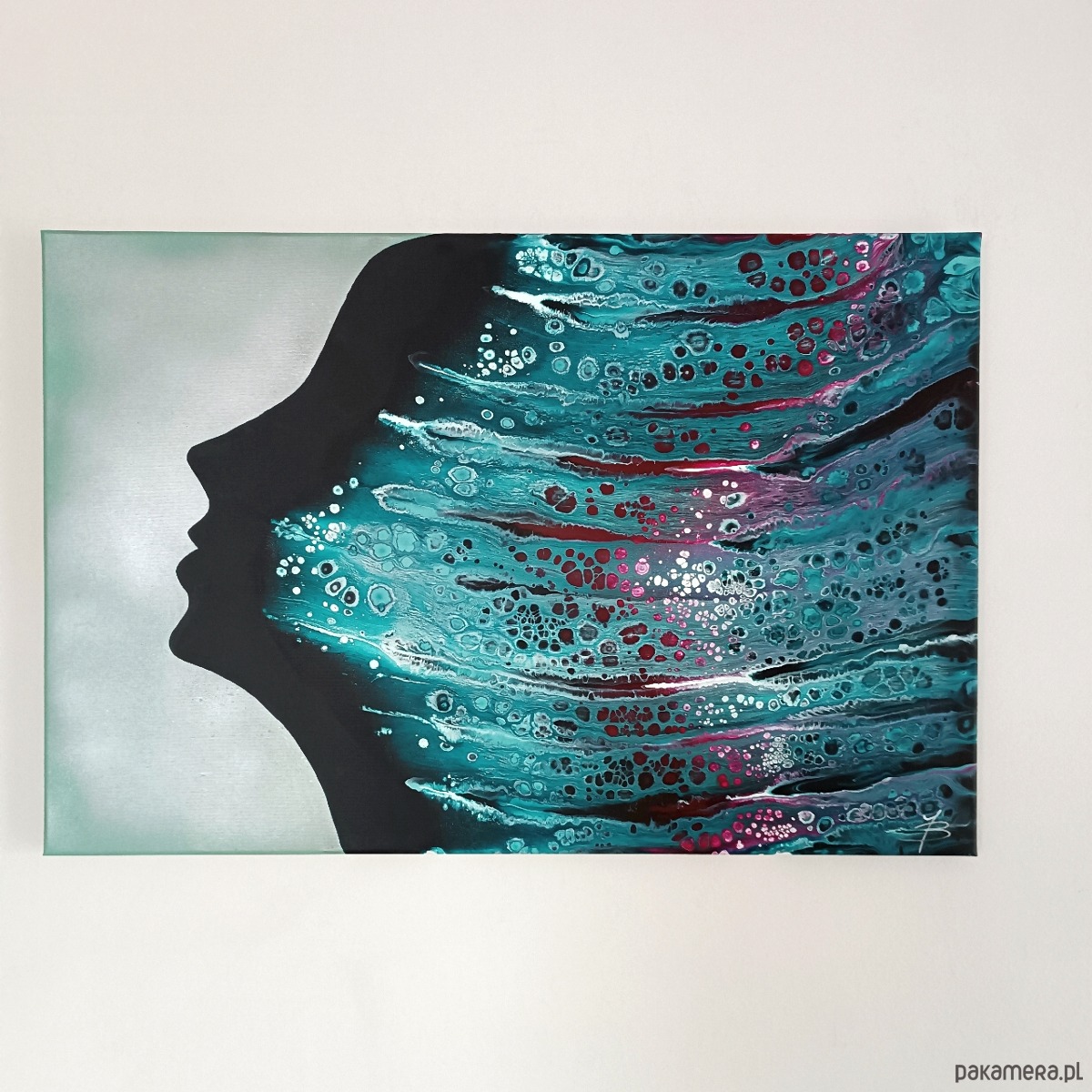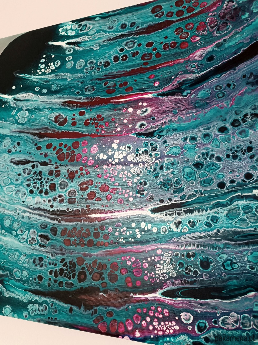Obraz malowany farbami akrylowymi na dobrej jakości podobraziu bawełnianym, techniką mieszaną (pouring spray), zabezpieczony werniksem. Sygnowany z boku podobrazia i podpisany z tyłu. Boki są przedłużeniem obrazu - gotowy do powieszenia bez ramy.
