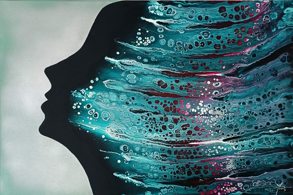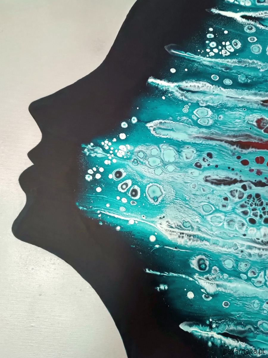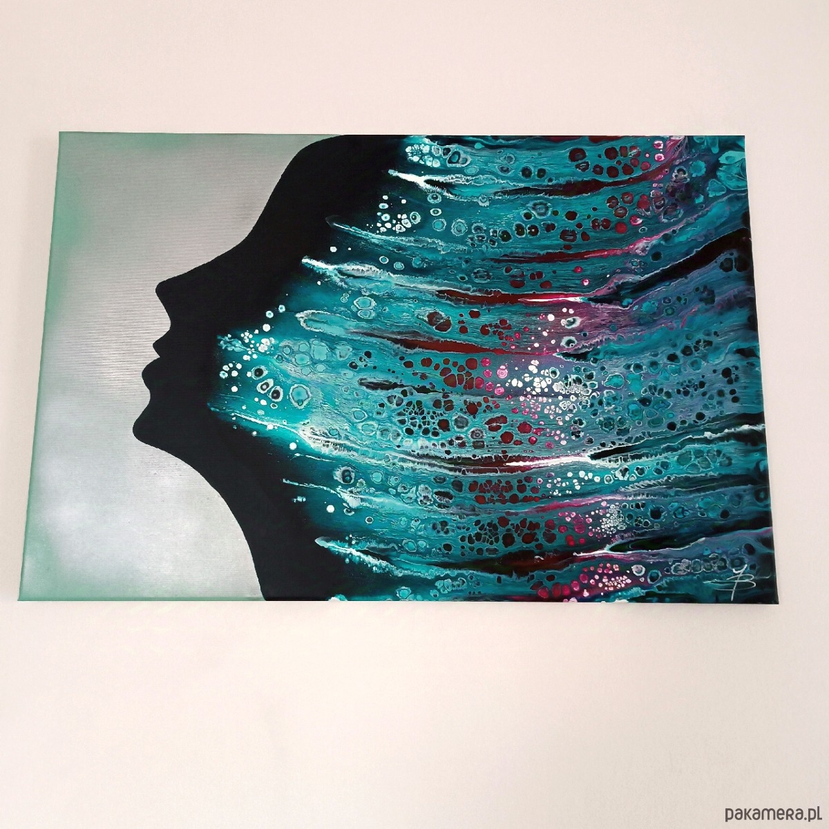 Obraz malowany farbami akrylowymi na dobrej jakości podobraziu bawełnianym, techniką mieszaną (pouring spray), zabezpieczony werniksem. Sygnowany z boku podobrazia i podpisany z tyłu. Boki są przedłużeniem obrazu - gotowy do powieszenia bez ramy.