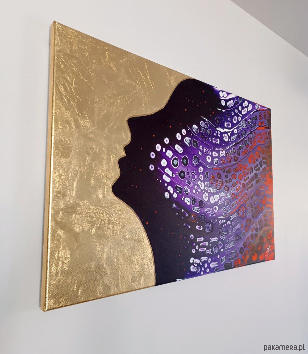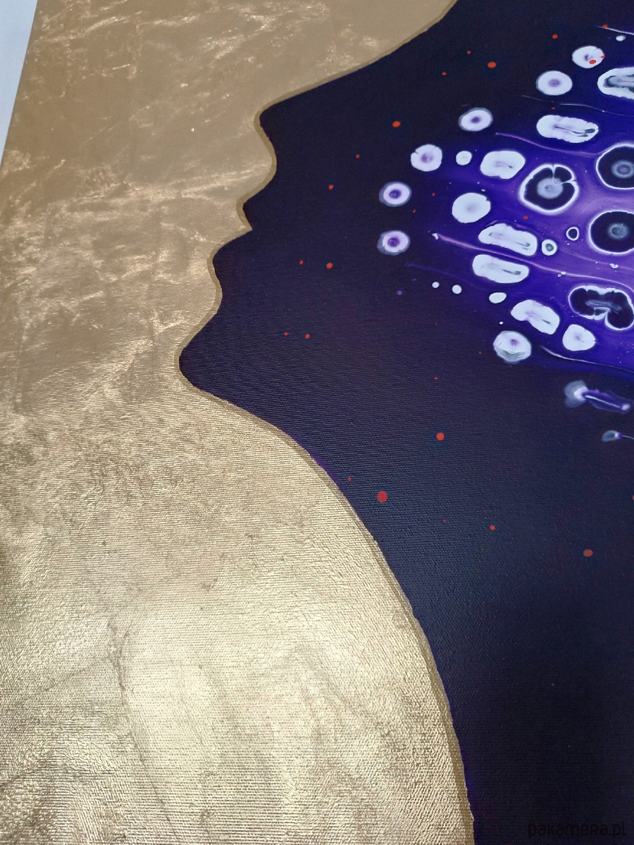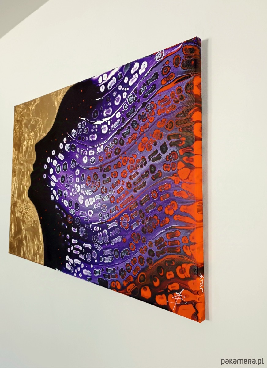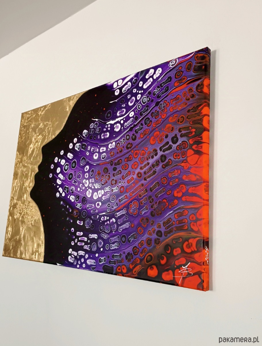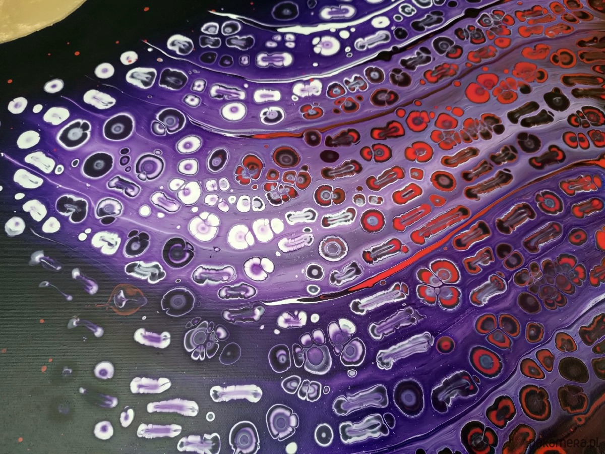 Obraz malowany farbami akrylowymi na dobrej jakości podobraziu bawełnianym, techniką pouringu, zabezpieczony werniksem. Sygnowany z boku podobrazia i podpisany z tyłu. Boki są przedłużeniem obrazu - gotowy do powieszenia bez ramy.