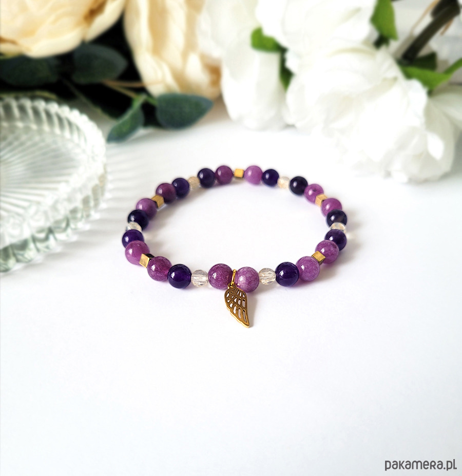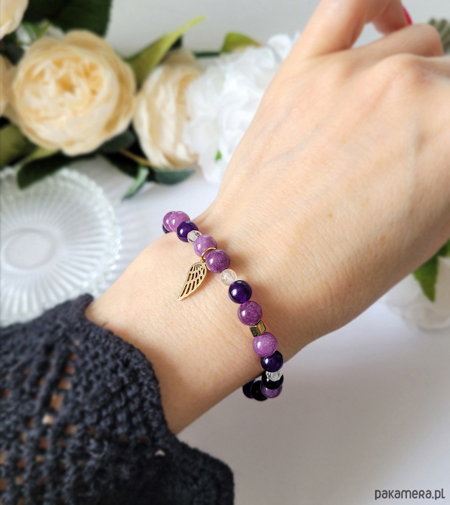 Piękna bransoletka zrobiona z kamieni naturalnych: Ametystu, Cytrynu, Lepidolitu oraz Hematytu w kolorze złota.
