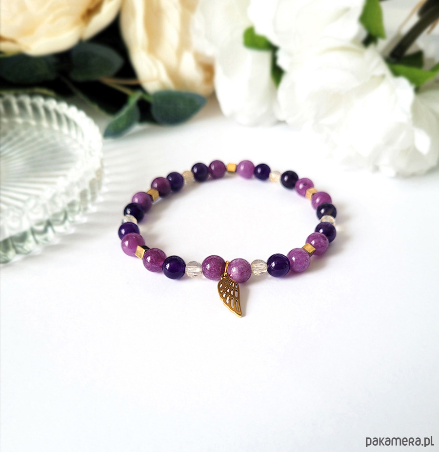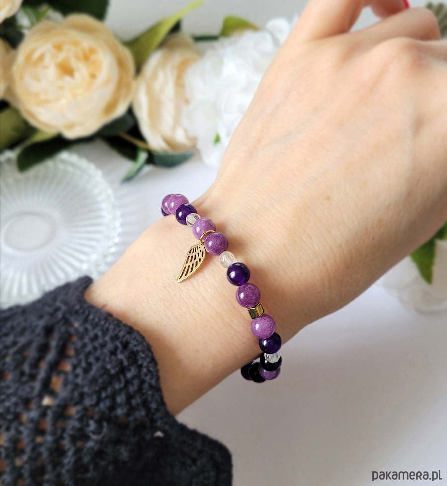 Piękna bransoletka zrobiona z kamieni naturalnych: Ametystu, Cytrynu, Lepidolitu oraz Hematytu w kolorze złota.