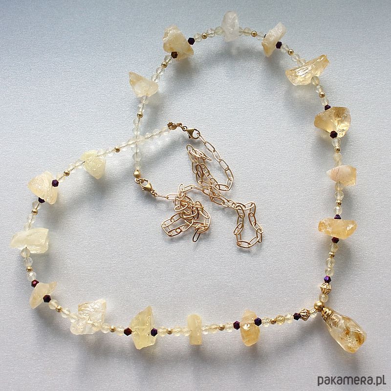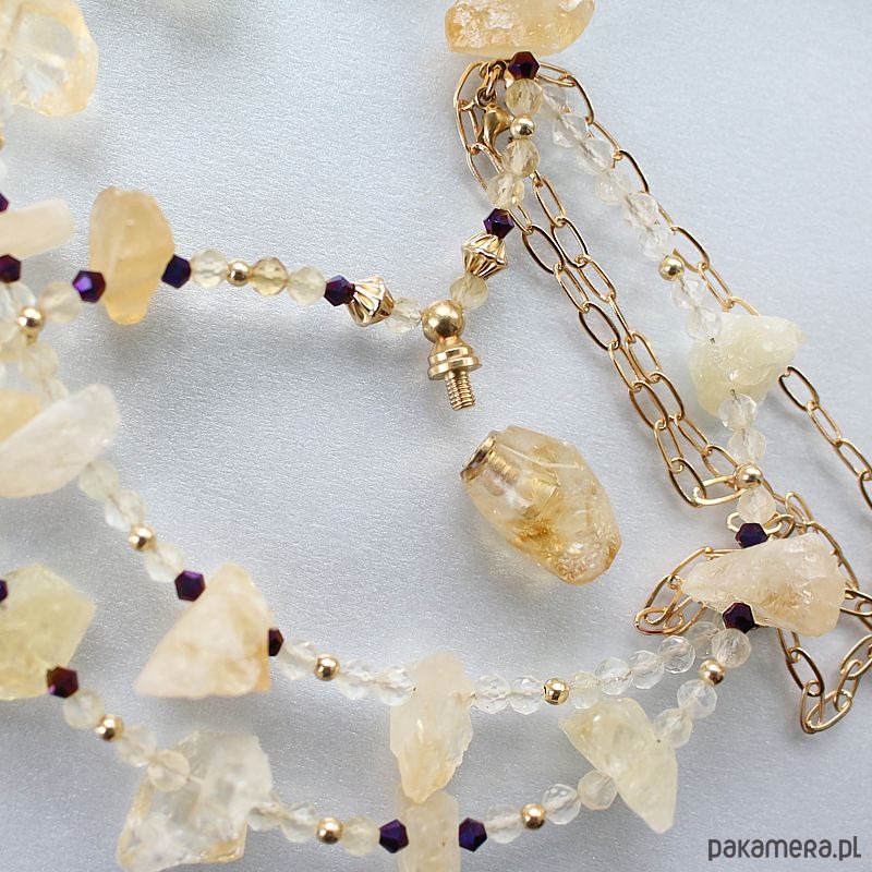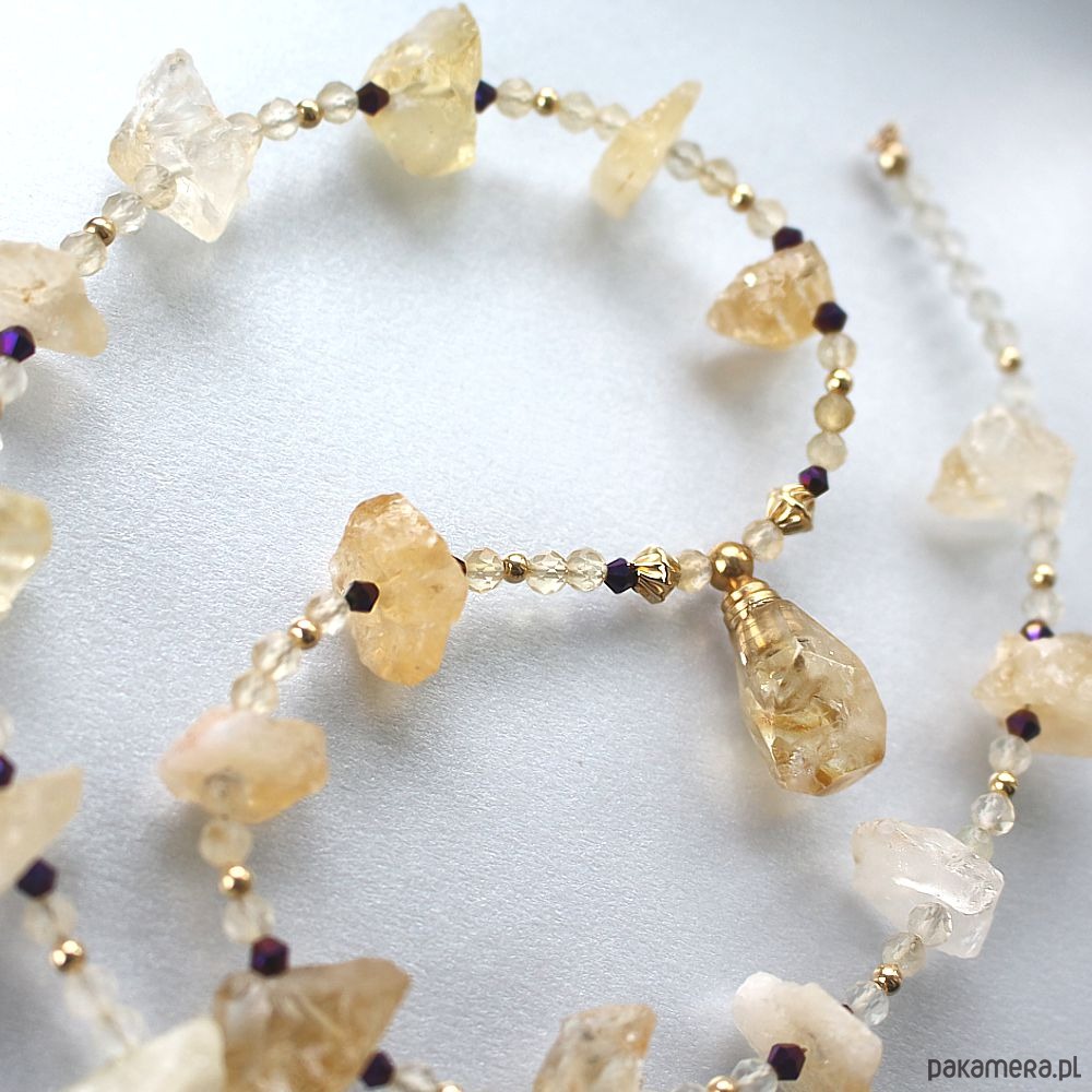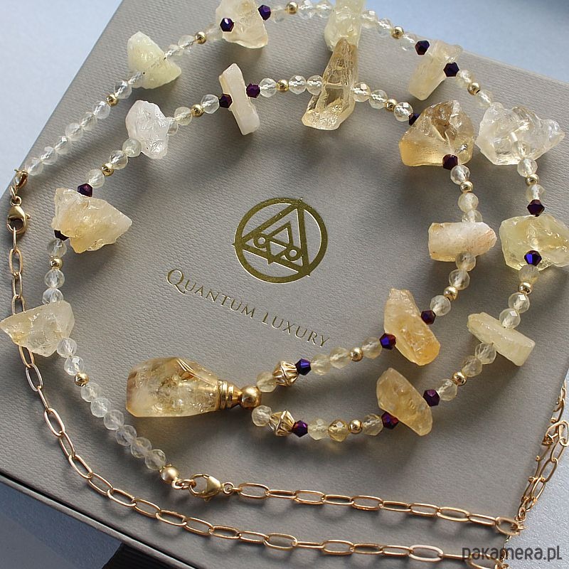 Osobisty talizman Wewnętrznej Mocy z surowych cytrynów ozdobiony flakonikiem na olejek eteryczny. Dwa zapięcia federing 8,0 mm i łańcuszek ze złota gold filled 14k + 38,0 cm. Dzięki podwójnemu zapięciu z przedłużką naszyjnik można nosić jako krótszą kolię lub dłuższy wisior.
