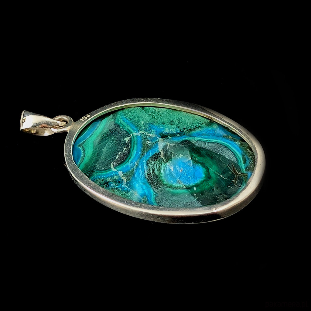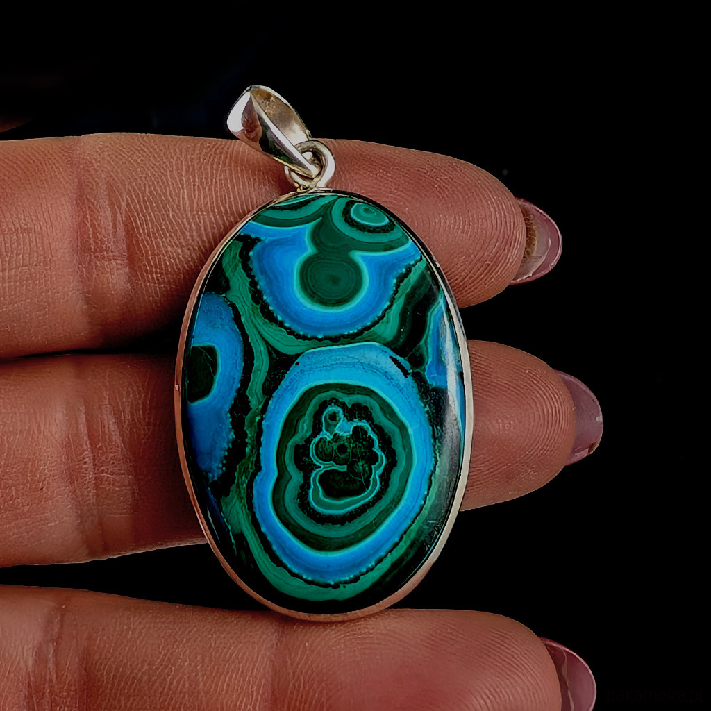 Wisior wykonany ze srebra próby 925 oraz pięknego malachitu z chryzokolą z unikalnym charakterystycznym dla tego kamienia malunkiem. Wymiary wisiora 38 x 28 mm. Długość całkowita 50 mm. Waga 11.6 g Tył otwarty. Wykonany przez dostawcę kamieni. Wisior zostanie zapakowany w ozdobne pudełeczko.
