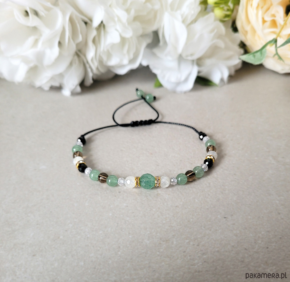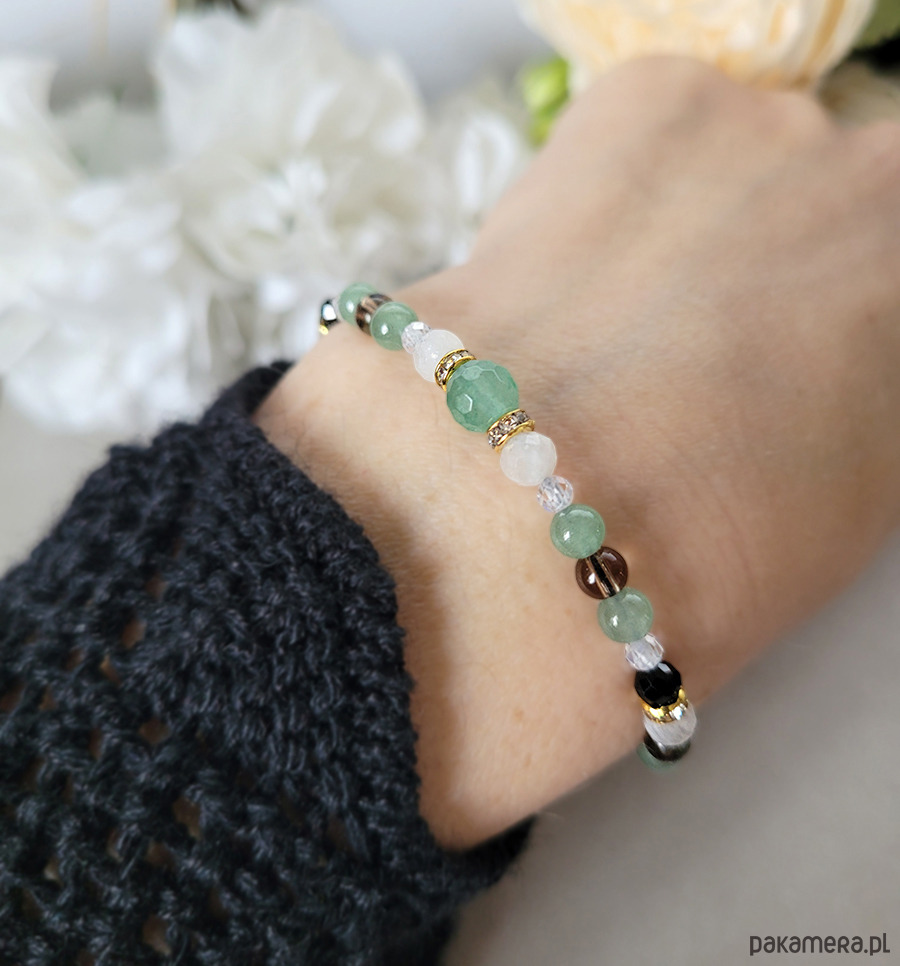 Damska bransoletka z kamieni naturalnych: Awenturynu, Kamienia księżycowego, Kwarcu dymnego, Spinelu oraz z Cyrkonii głównie przeznaczona dla zodiakalnego Raka.