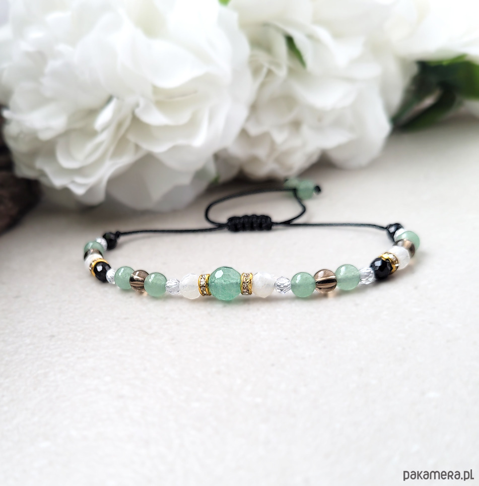 Damska bransoletka z kamieni naturalnych: Awenturynu, Kamienia księżycowego, Kwarcu dymnego, Spinelu oraz z Cyrkonii głównie przeznaczona dla zodiakalnego Raka.