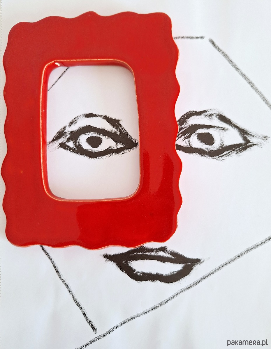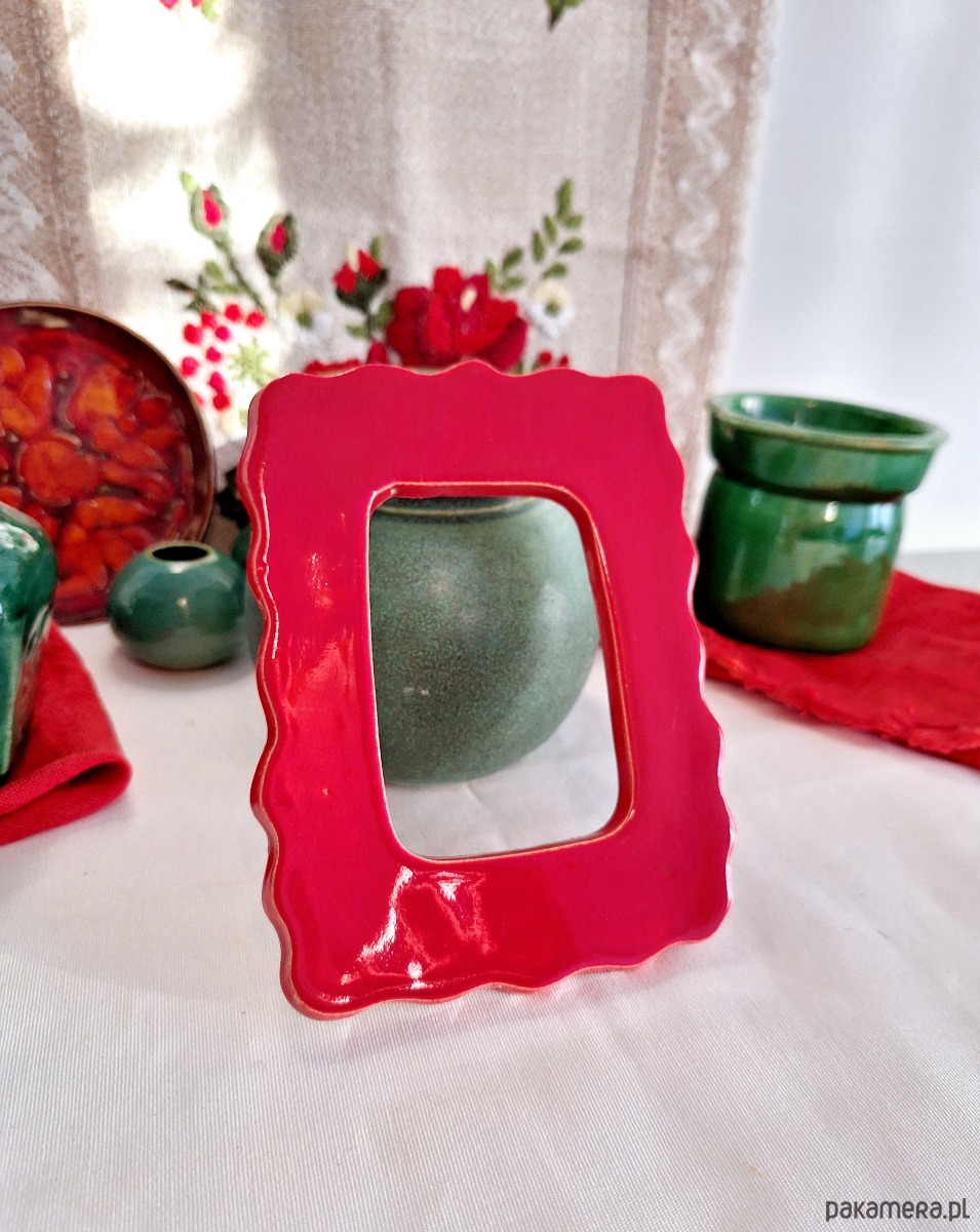 Ceramiczna ramka dekoracyjna. Zaokrąglony fantazyjny kształt, intensywny czerwony błyszczący kolor. Z tyłu metalowy haczyk do zawieszenia ramki na ścianie. Ramka ręcznie formowana i szkliwiona. Może stanowić obramowanie dla zdjęć, widokówek czy obrazków. Piękny prezent do pokoju dziecięcego lub dla ukochanej osoby.