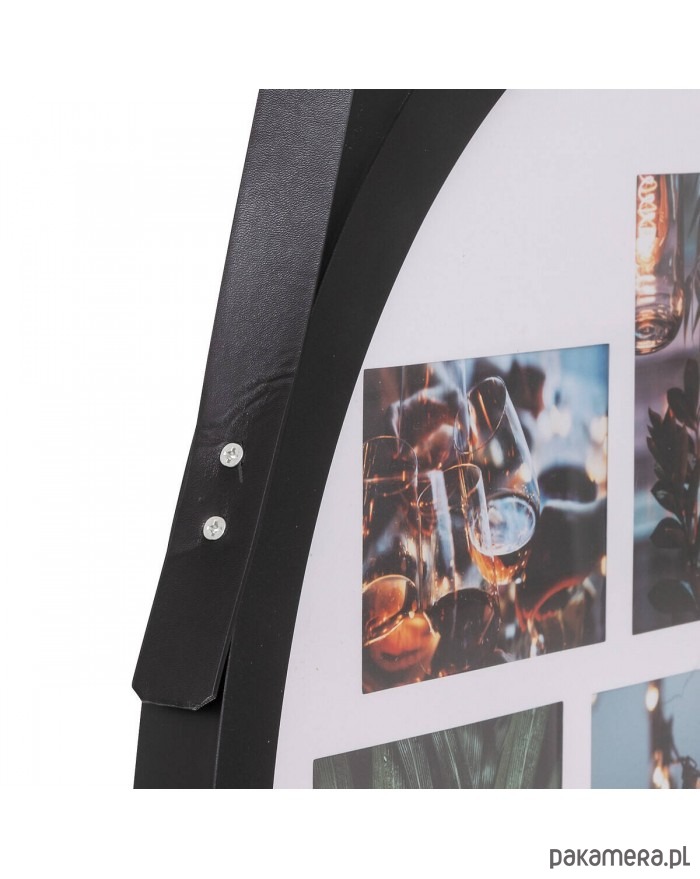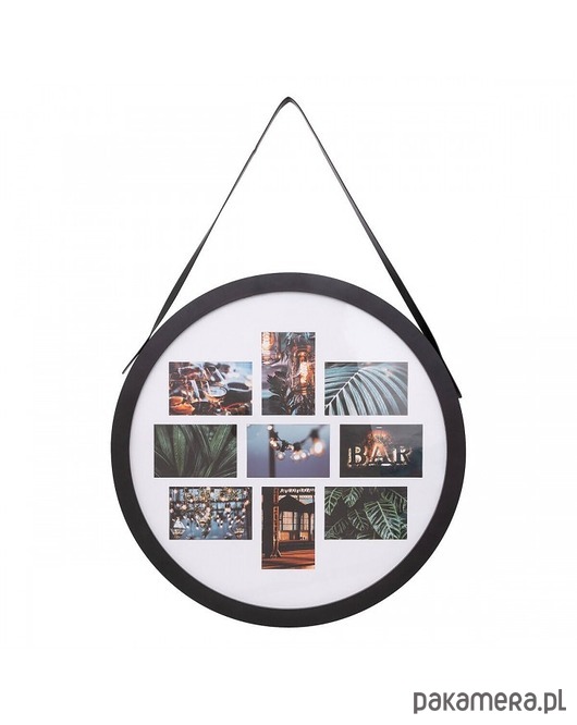 Okrągła ramka zawieszona na pasku została wykonana z czarnego tworzywa sztucznego. Może zmieścić 9 zdjęć. Będzie ładną ozdobą salonu, przedpokoju czy sypialni.