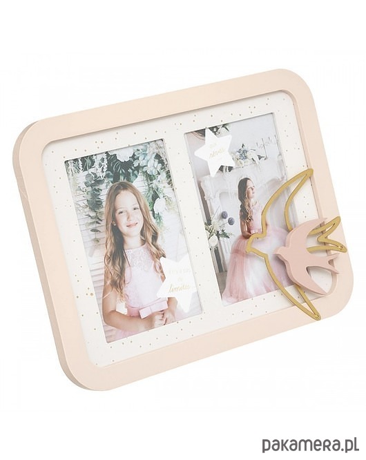 Urocza ramka do pokoju dziewczynki. Wykonana z MDF. W kolorze różowym. Na dwa zdjęcia. Ozdobiona dekorem z motywem mew.