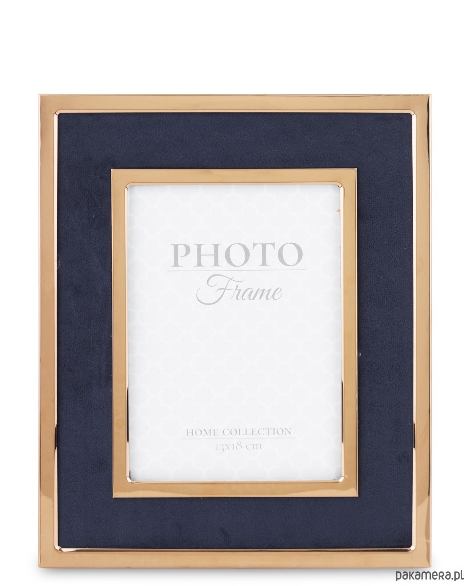Elegancka ramka na zdjęcia wykonana z MDFu, metalu i tkaniny w kolorach złotym i granatowym. Wyposażona w nóżkę do ustawienia na blacie szafki. Będzie się świetnie prezentować zarówno mieszkaniu jak i w biurze. Ze względu na szerokość obramowania jest dostosowana do zdjęć 15x20 cm.