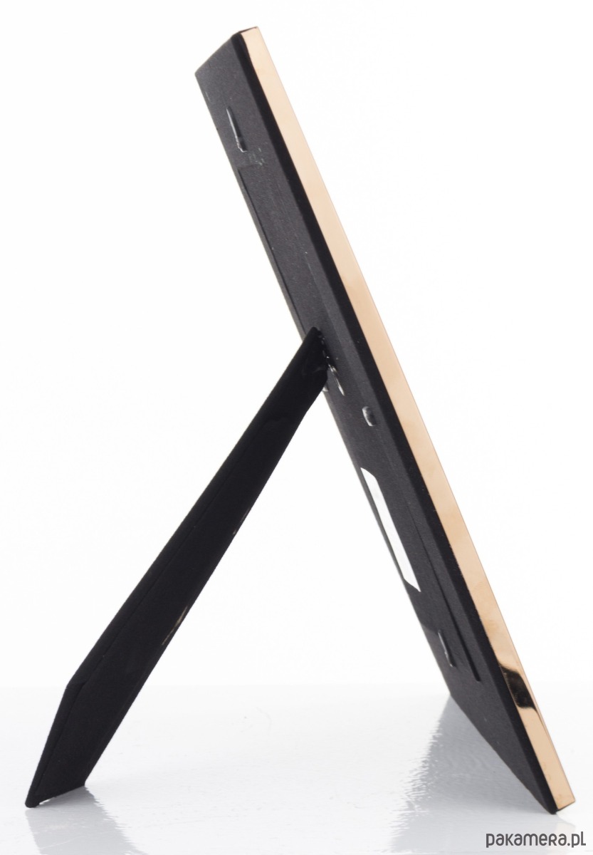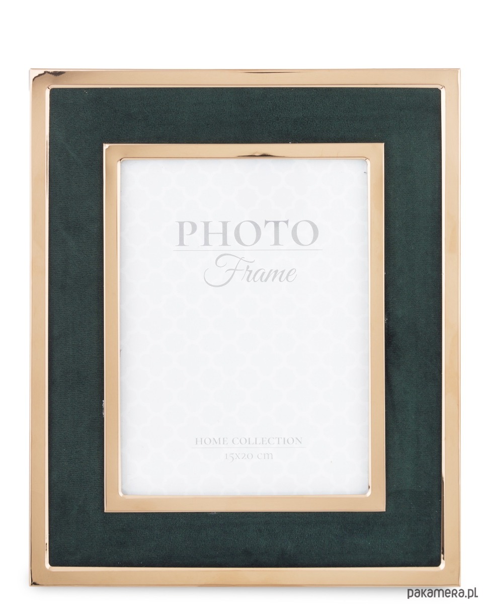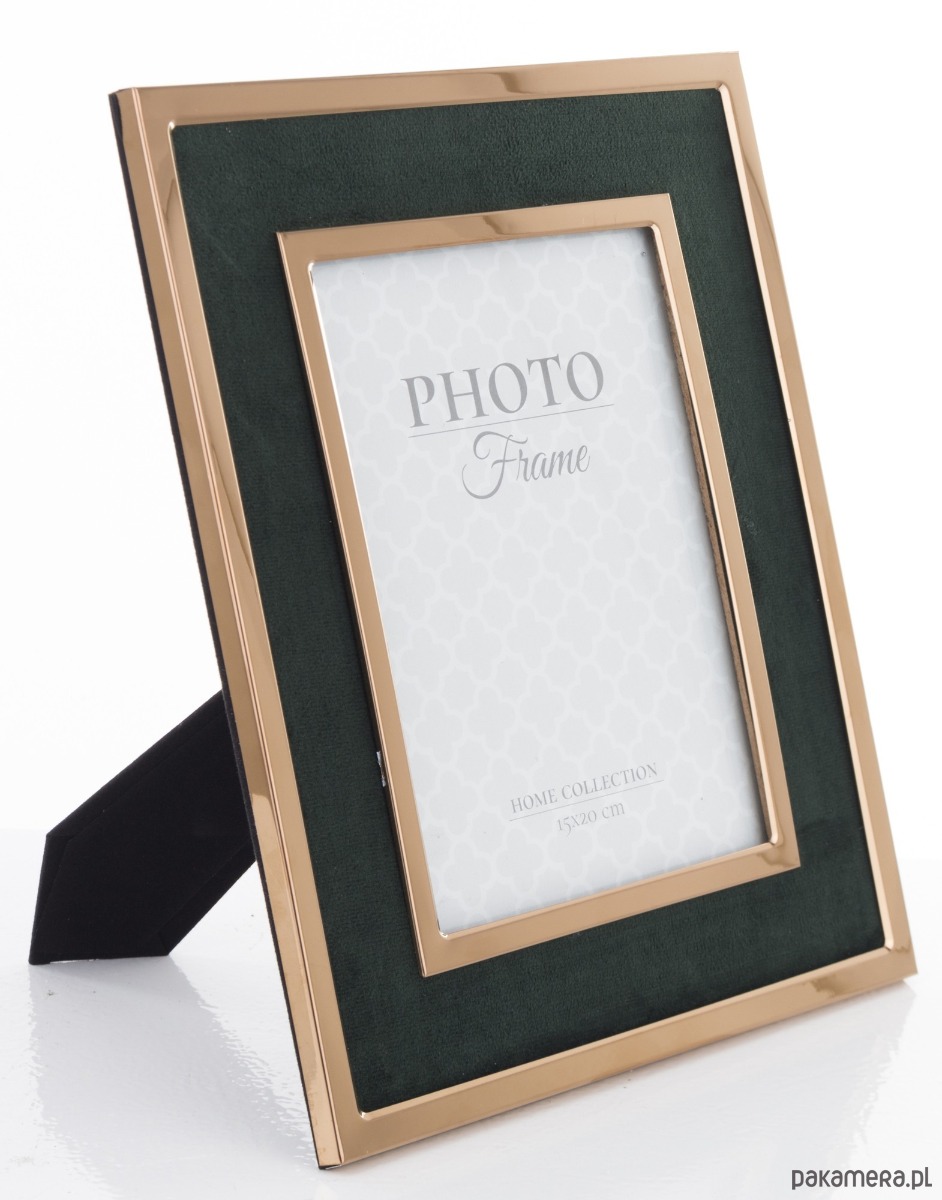 Elegancka ramka na zdjęcia wykonana z MDFu, metalu i tkaniny w kolorach złotym i ciemnozielonym. Wyposażona w nóżkę do ustawienia na blacie szafki. Oprócz tej podstawki, ramka została również wyposażona w kółeczka do powieszenia na ścianie. Będzie się świetnie prezentować zarówno mieszkaniu jak i w biurze. Ze względu na szerokość czarnego obramowania jest dostosowana do zdjęć 15x20 cm.