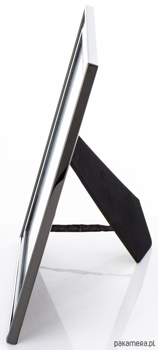 Ramka na pojedyncze zdjęcie została wykonana z metalu w kolorze srebrnym oraz grafitowym i szkła. Specjalna nóżka umożliwiająca postawienie ramki na półce została umieszczona na odwrocie produktu i jest zabezpieczona tasiemką przed rozłożeniem się na płasko. Zdjęcia o wymiarach 20x25 cm będą się dobrze prezentowały w tej ramce.