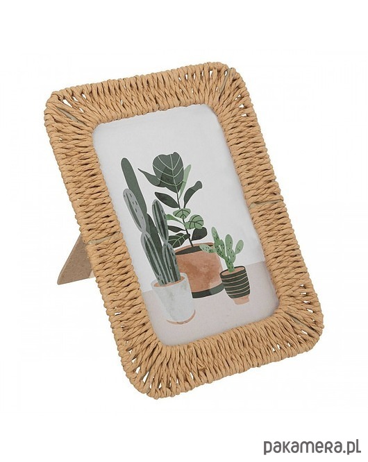 Stojąca ramka na zdjęcie w kolorze beżowym. Została wykonana z papierowego sznurka, który misternie wypleciony stanowi piękną obramowanie okalające fotografię.