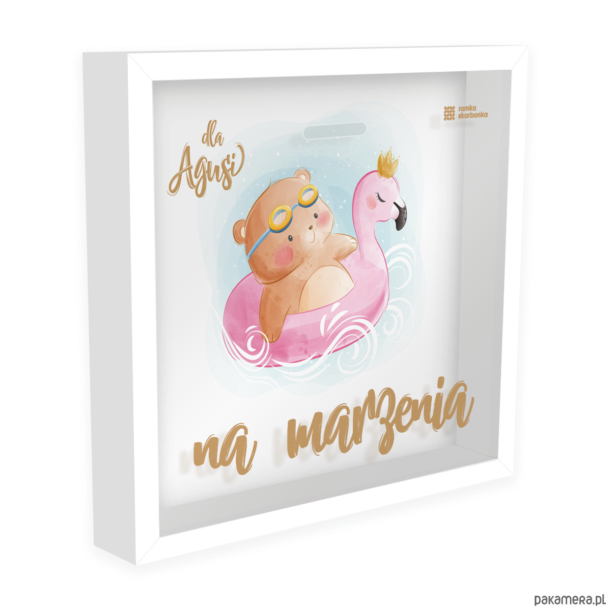 Ramka Skarbonka – Na marzenia – Misiu na flamingu (personalizowana)