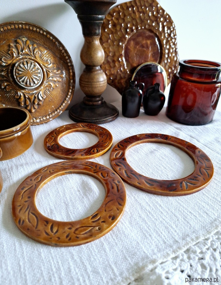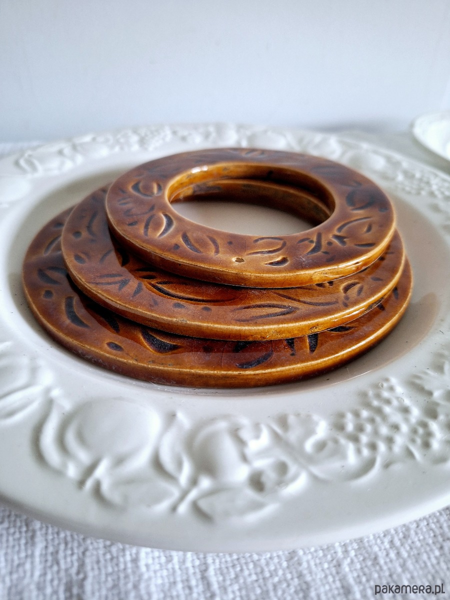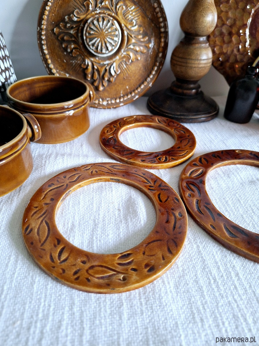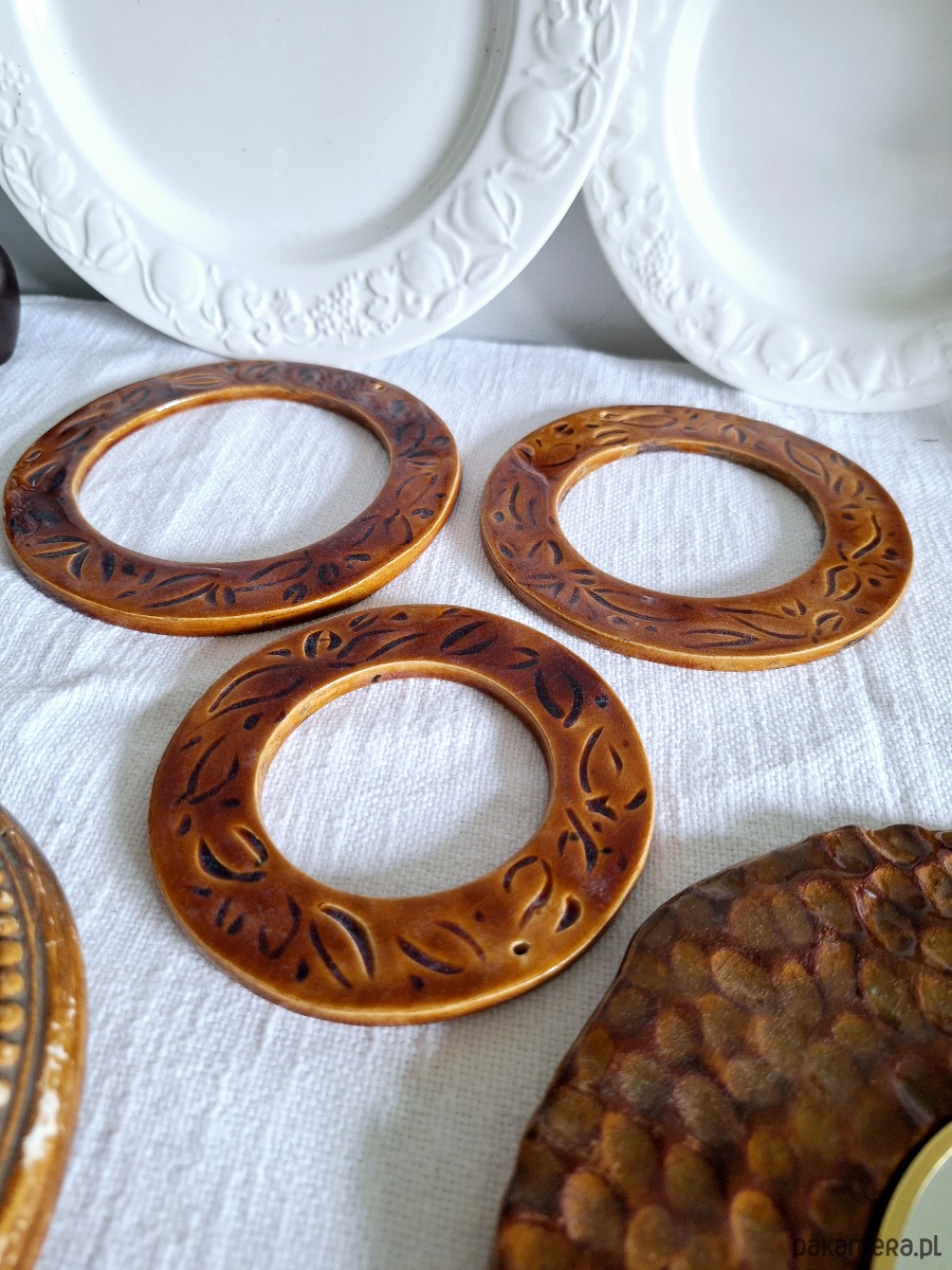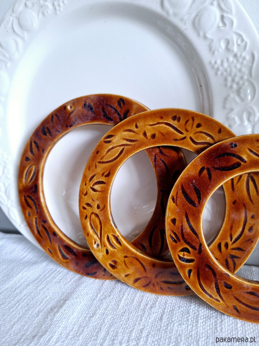 Dekoracyjne ramki ceramiczne 3 sztuki. Ramki ręcznie formowane i szkliwione kolorem bursztynowym z miejscowymi zdobieniami. Kompozycja stanowi nietuzinkową dekorację, może być samodzielnym dekorem ściennym lub jako obramowanie dla fotografii i obrazków. W każdej znajduje się mała dziurka umożliwiająca zawieszenie na ścianie.