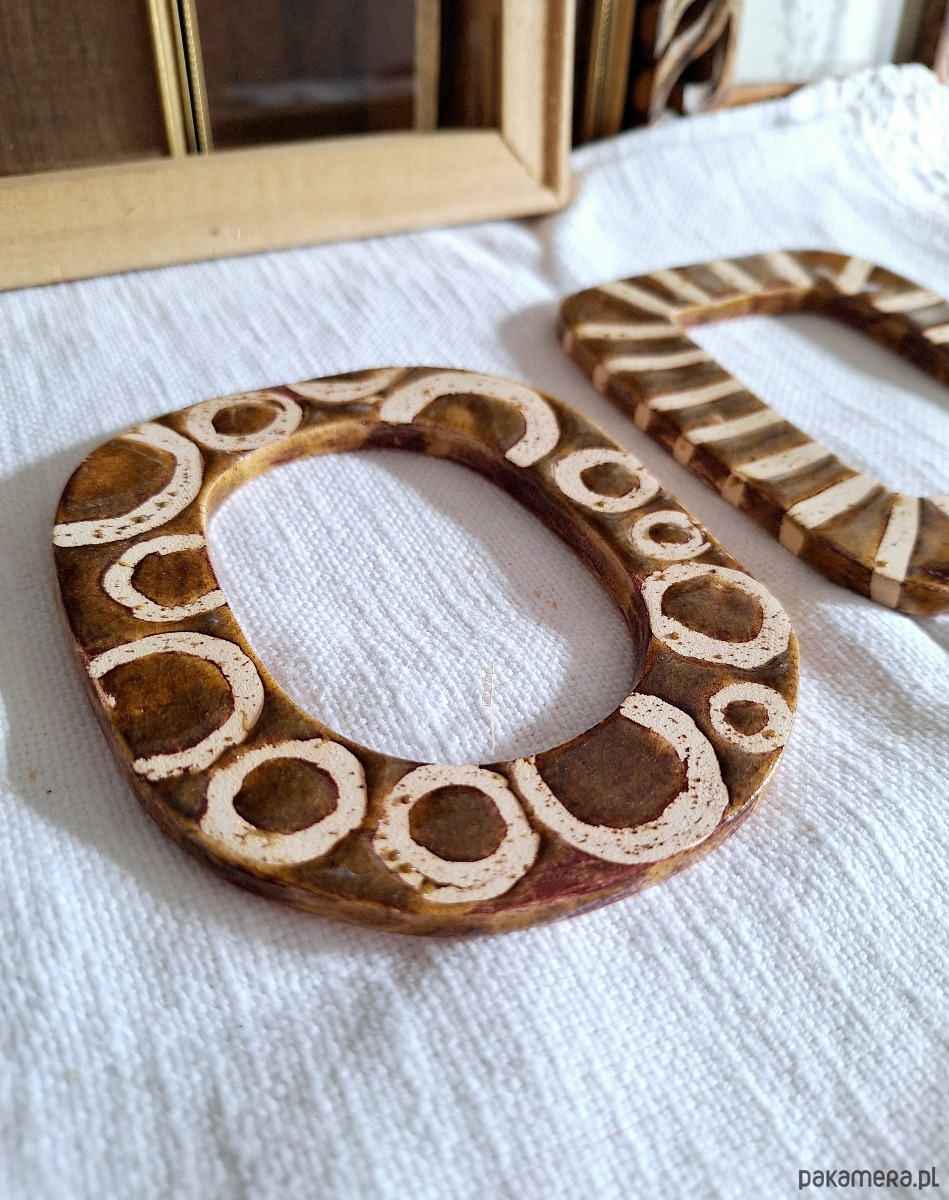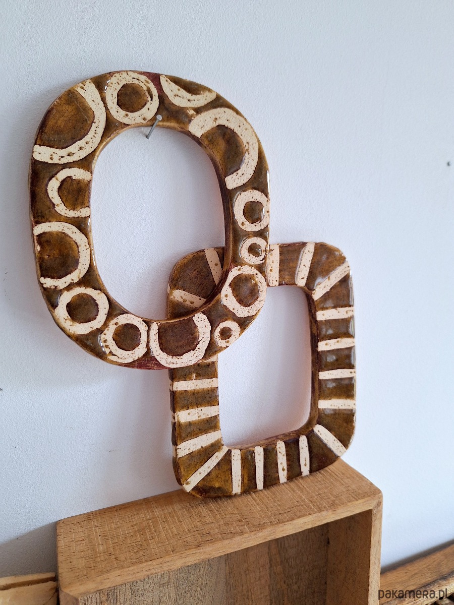 Dwie ramki ceramiczne. Ramki ręcznie formowane i szkliwione kolorem beżowym i brązowym. Zdobienia w postaci pasków i okręgów. Kompozycja stanowi nietuzinkową dekorację ścienną, może stanowić samodzielny dekor ścienny lub jako obramowanie dla fotografii i obrazków.