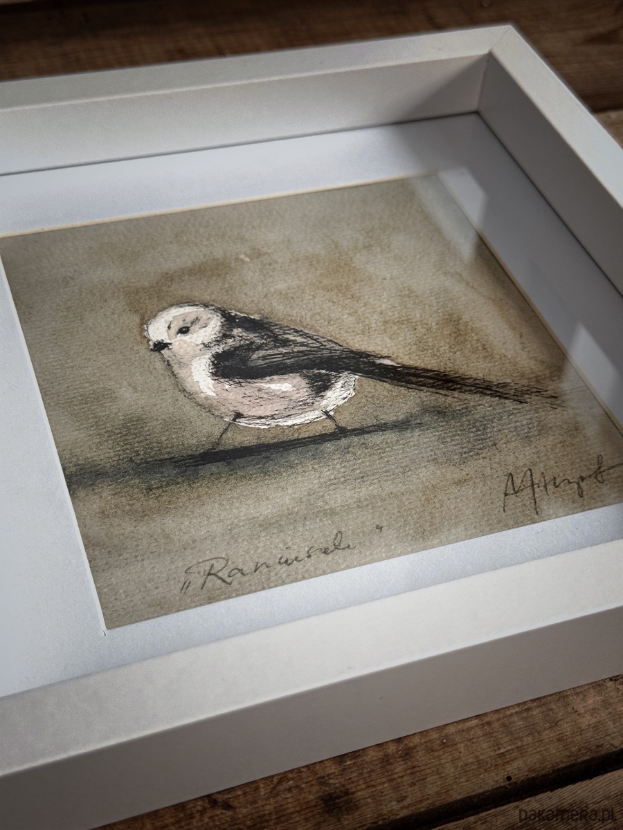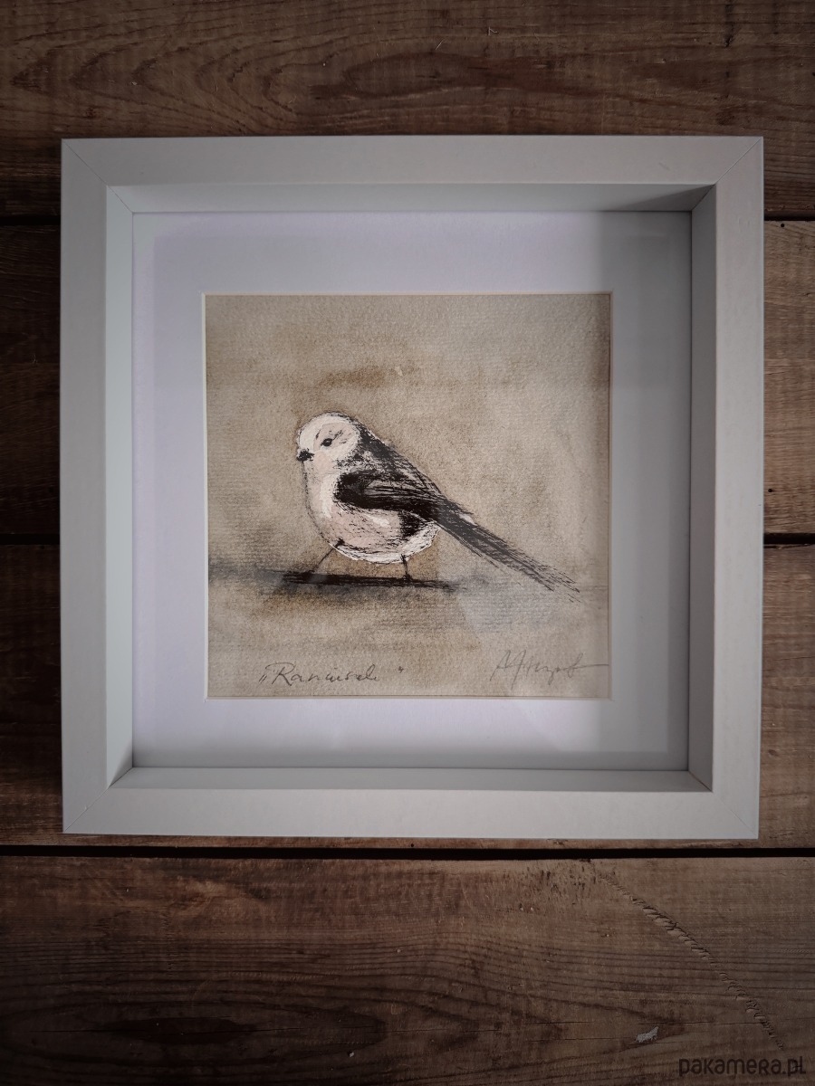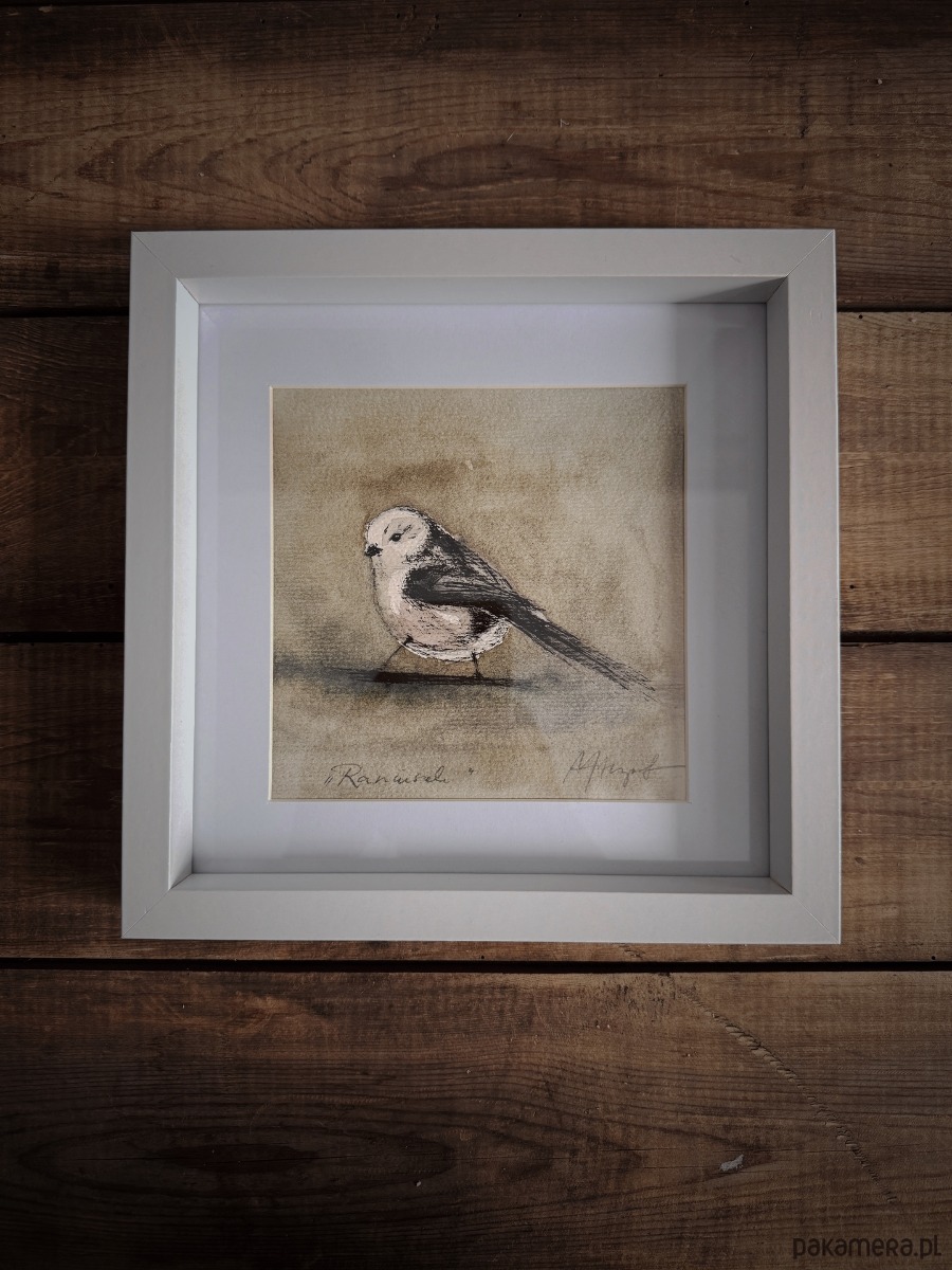 Oprawa: praca sprzedawana z passe-partout / w białej ramce / szklana szybka.