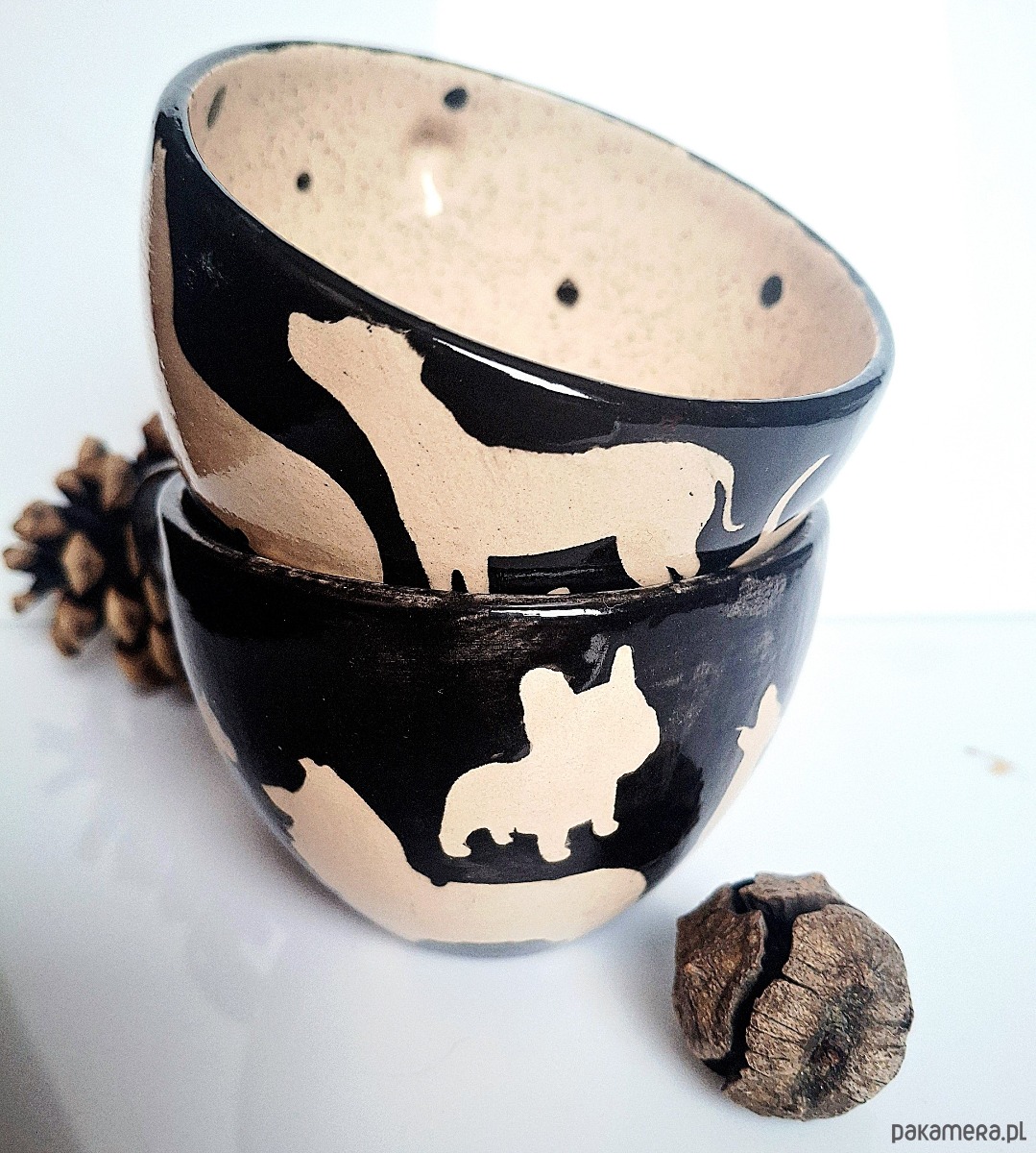 Każda filiżanka przedstawia motywy różnych ras psów. Kolory filiżanek to czarny i ecru, z subtelnymi różnicami odcieni i przejściami barw, które nadają im wyjątkowy charakter. Wnętrze zdobione jest delikatnymi kropkami i serduszkiem na dnie.