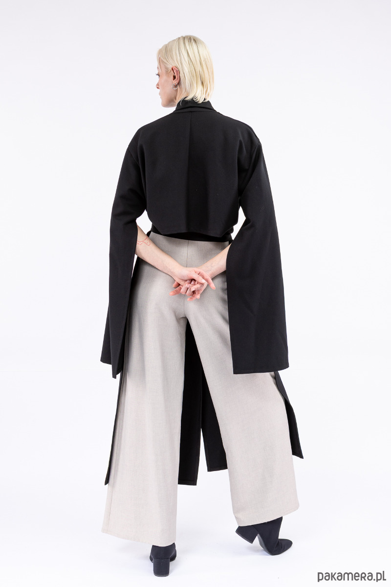 krój inspirowany kimonem, szerokie, pękniete rękawy nadają charakteru całości, a krótki tył uzupełnia niebanalnie fason.