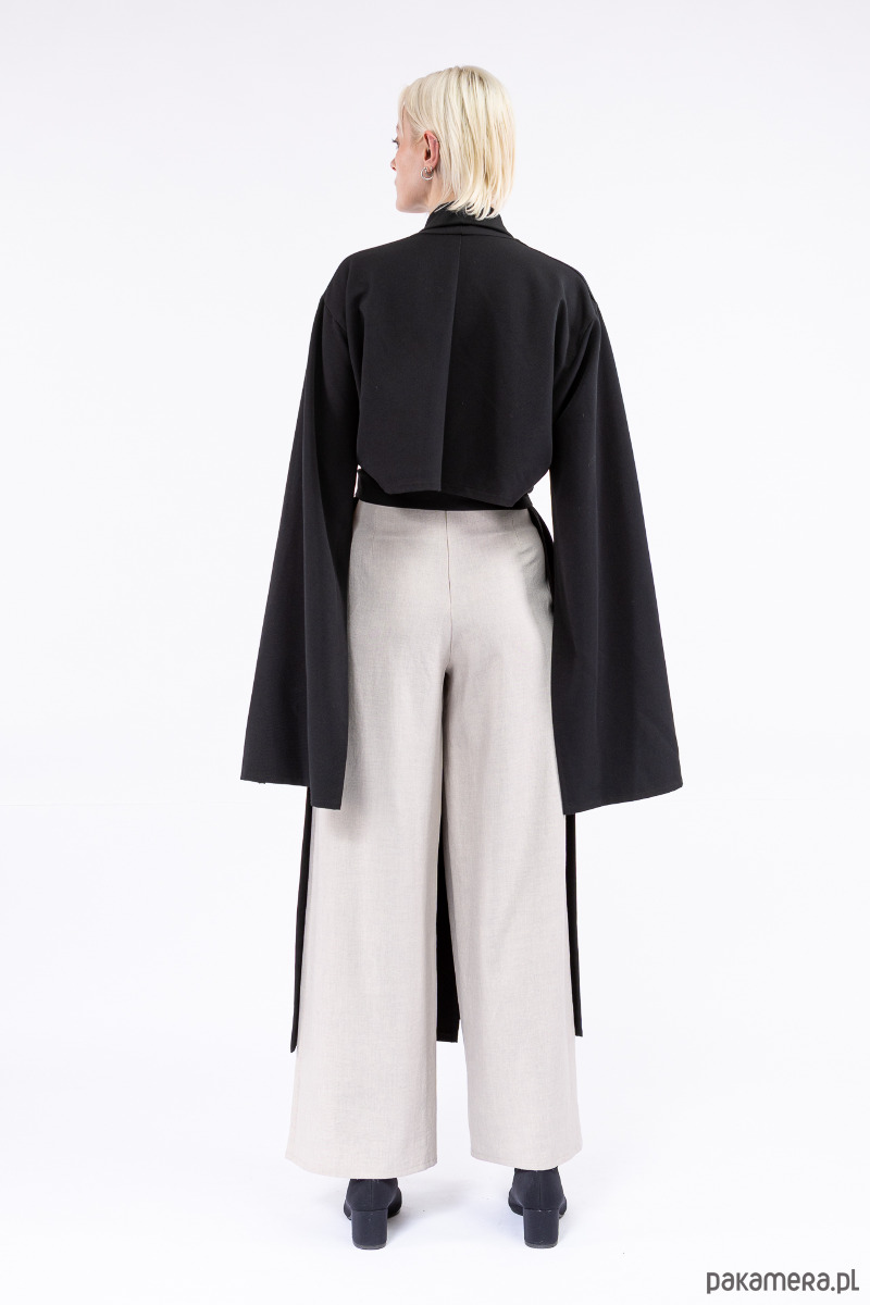 krój inspirowany kimonem, szerokie, pękniete rękawy nadają charakteru całości, a krótki tył uzupełnia niebanalnie fason.