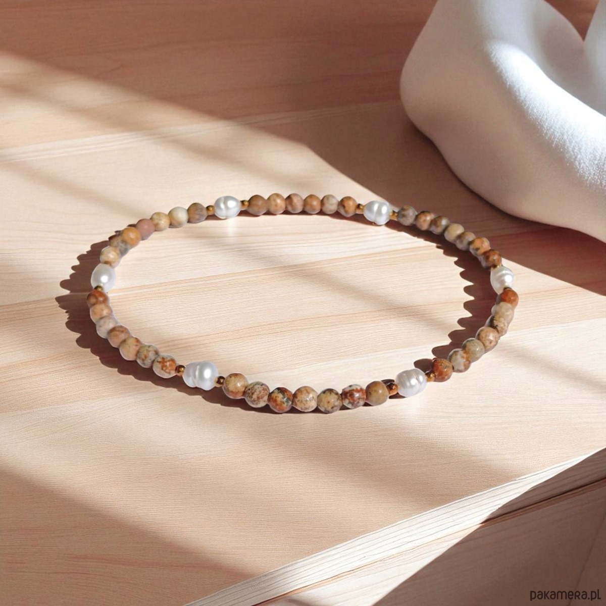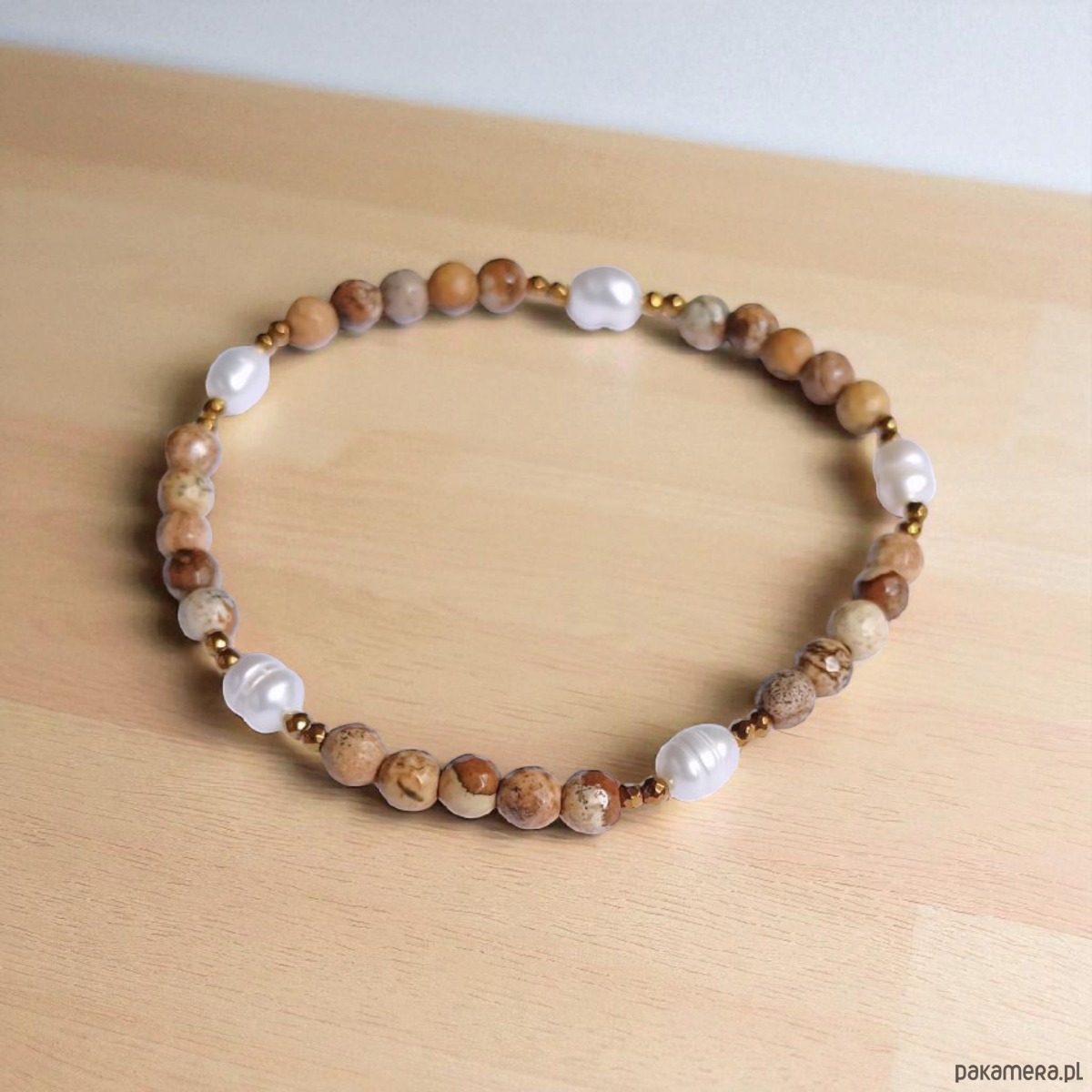 Bransoletki na solidnej lince elastycznej, wykonana z jaspisu krajobrazowego w odcieniach beżu i brązu (fasetowane kule 4mm), pereł słodkowodnych, fasetowanego hematytu.